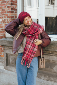Bordeaux met zwart en lila geruite sjaal. Super zachte stof!