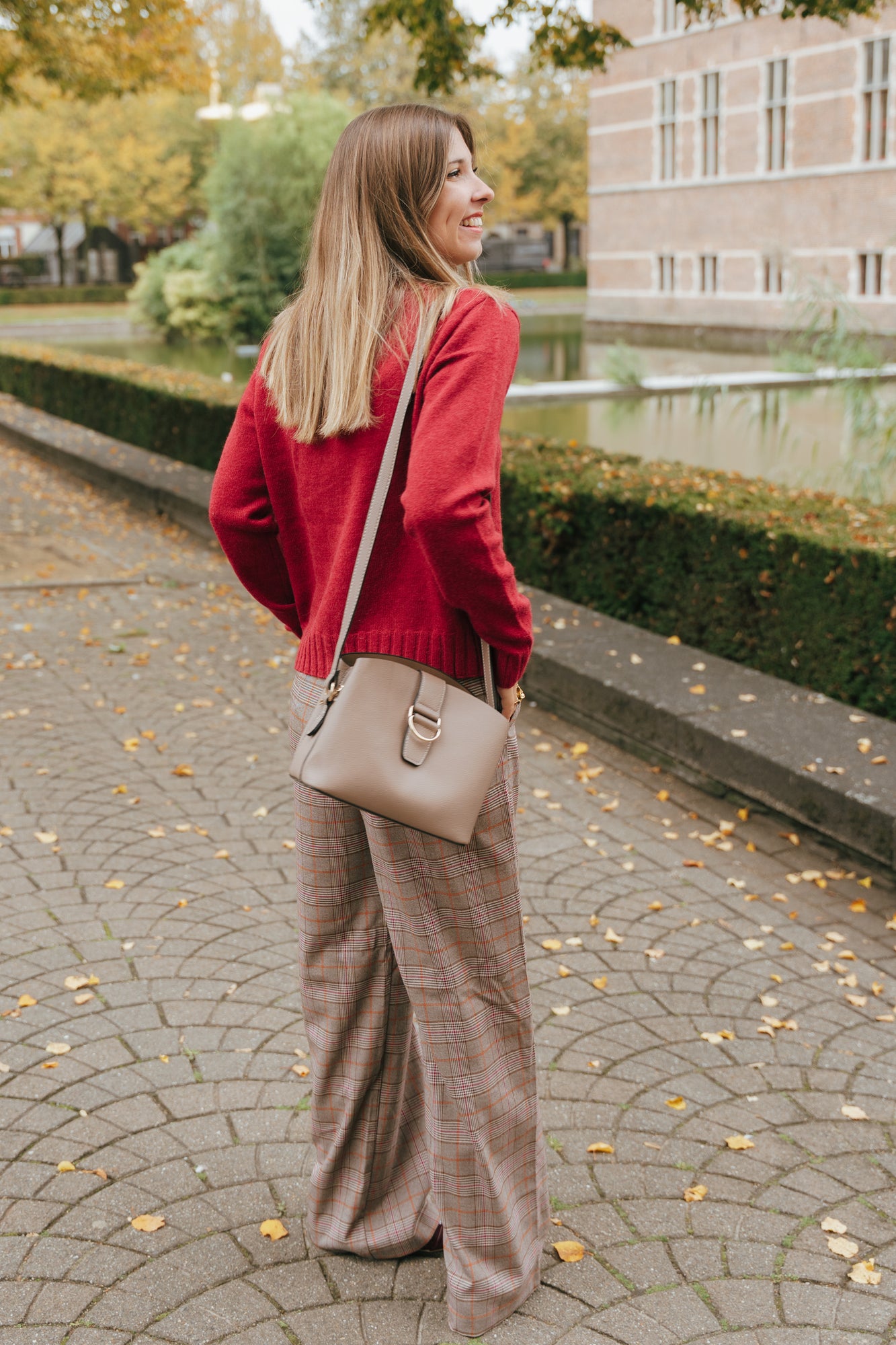 Taupe crossbody tas met gouden gesp. De tas sluit met een rits en heeft binnenin twee aparte vakjes zonder rits en eentje met rits.
