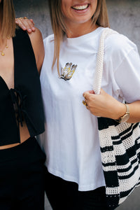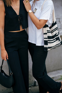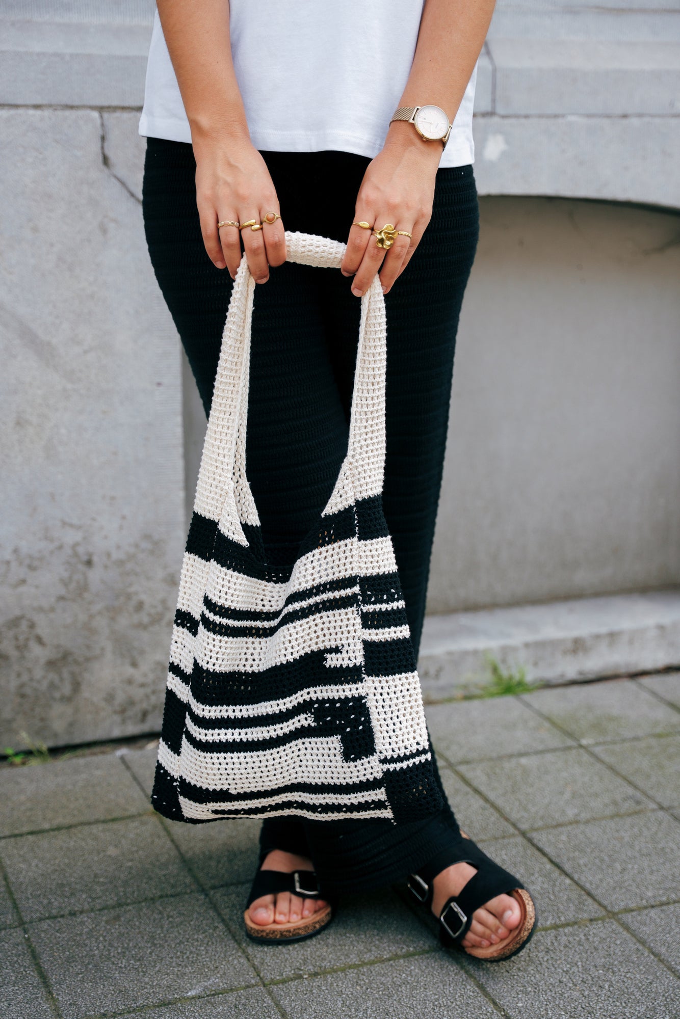 Ecru crochet tas met zwarte accenten. Heel handig als every day bag of als strandtas om all je essentials mee te nemen.