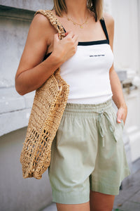 Vlotte zomershirt met een rekker aan de taille en een lint om te strikken. Hiermee kan je hem ook vaster aantrekken. Super leuk om als setje te dragen samen met de Kloe shirt kaki.