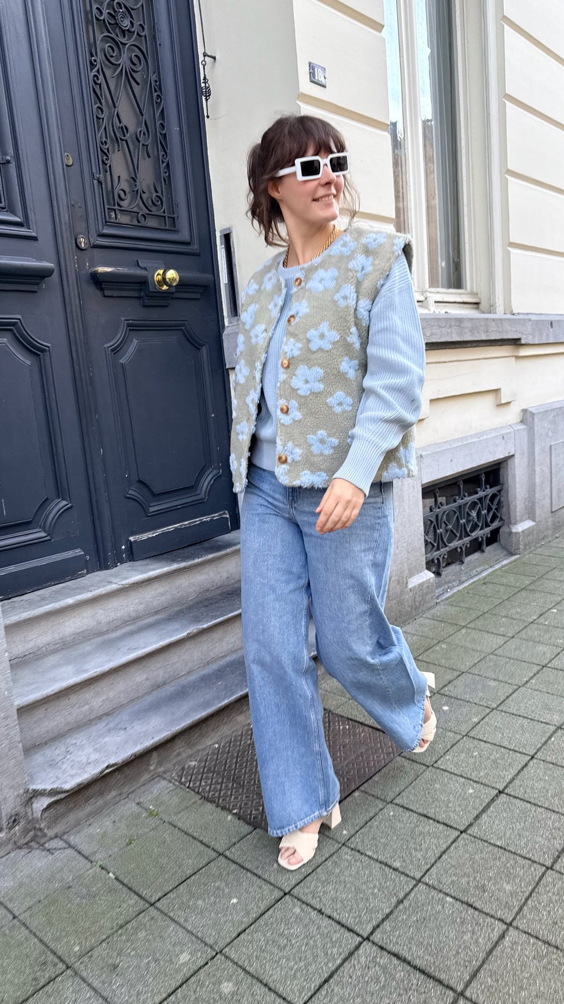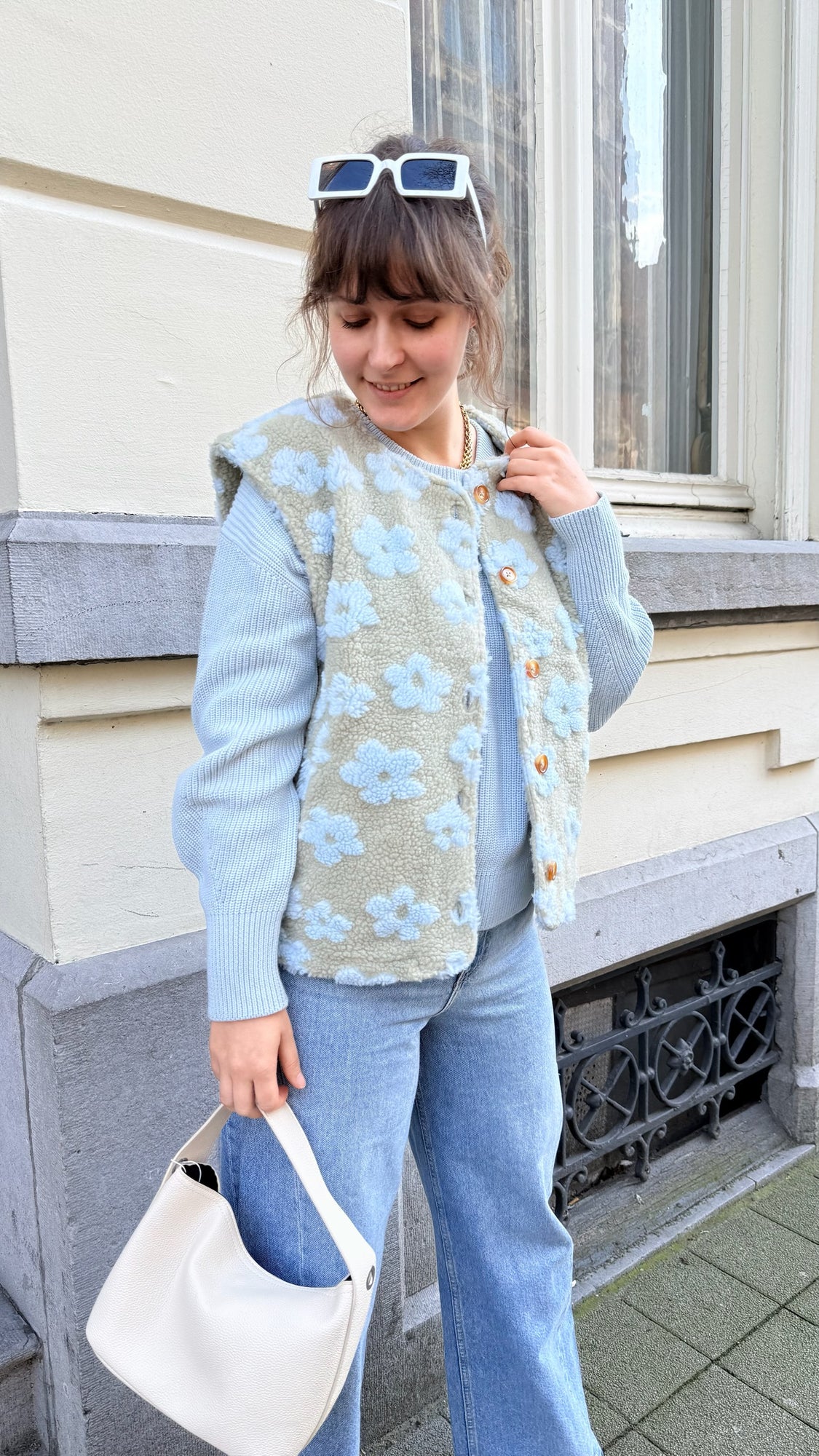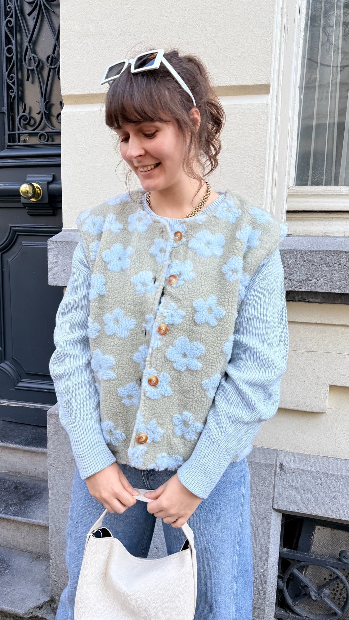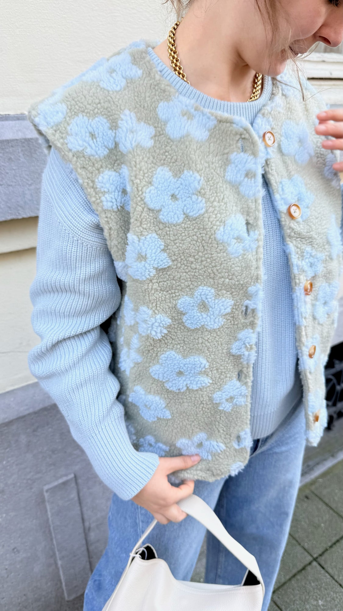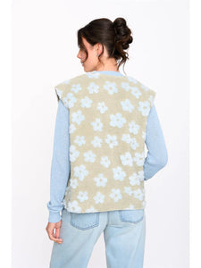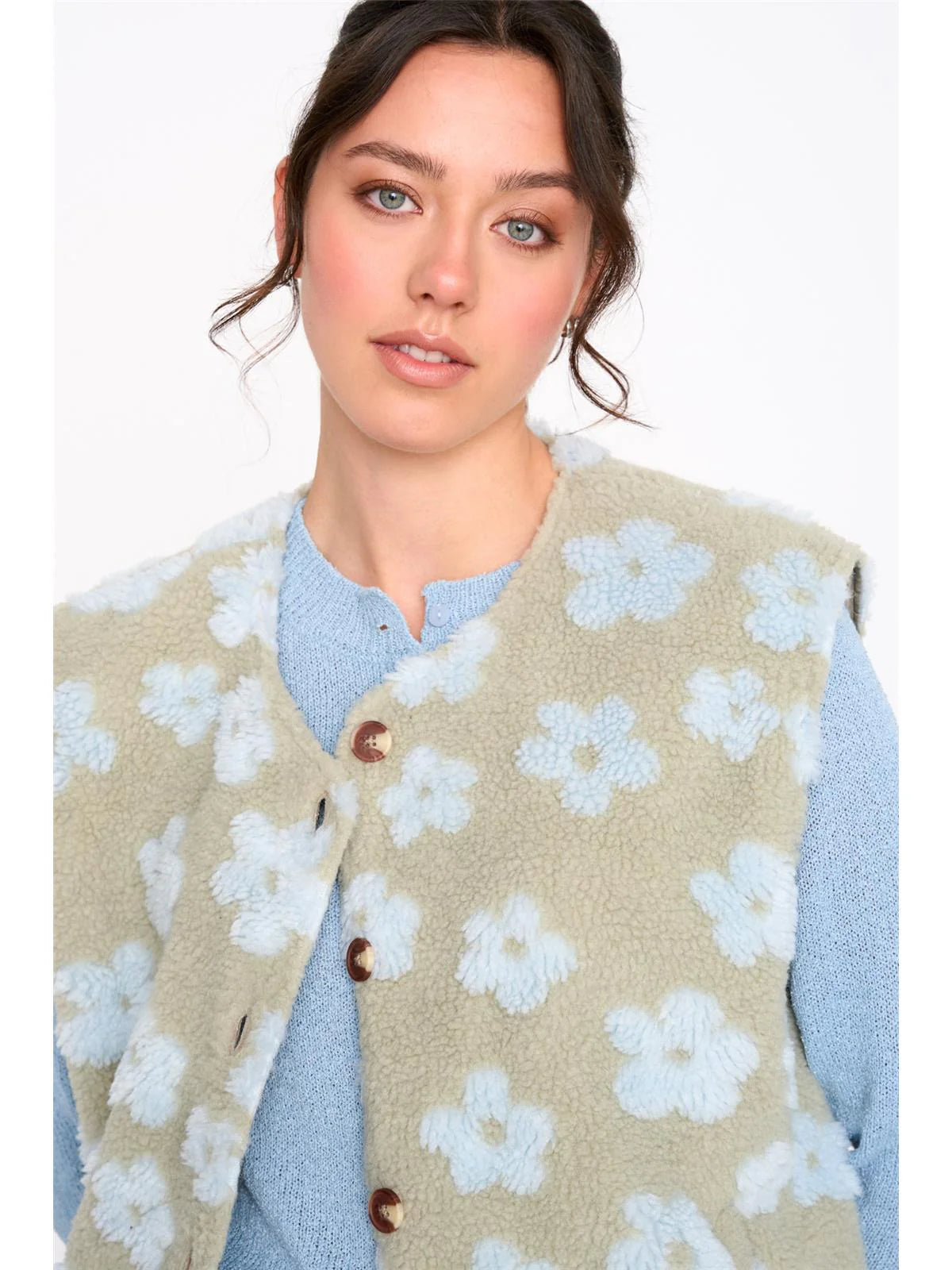 Super schattige groene teddy gilet met blauwe bloemetjes. De gilet heeft bruine knopen en steekzakken.