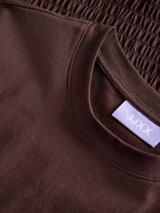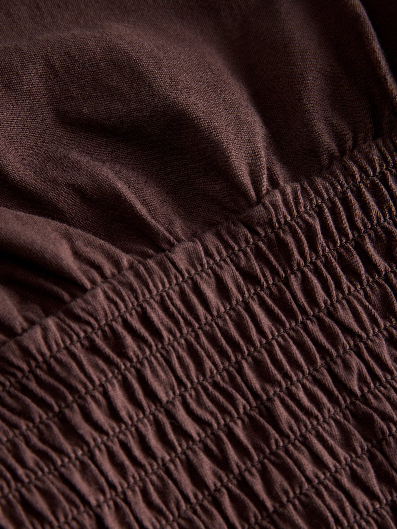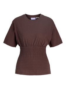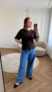Bruin T-shirt met smockdetail in de taille waardoor het mooi gecentreerd valt en een ruffle aan de onderkant. Geweldige everyday basic with a twist!