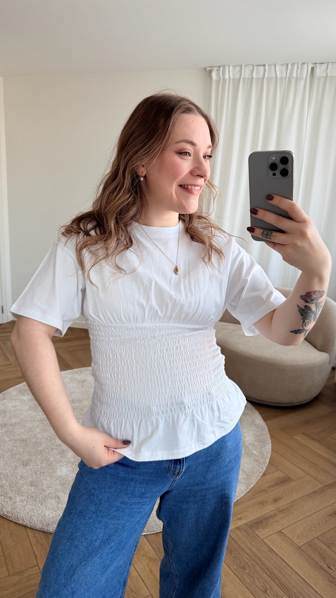 Wit T-shirt met smockdetail in de taille waardoor het mooi gecentreerd valt en een ruffle aan de onderkant. Geweldige everyday basic with a twist!