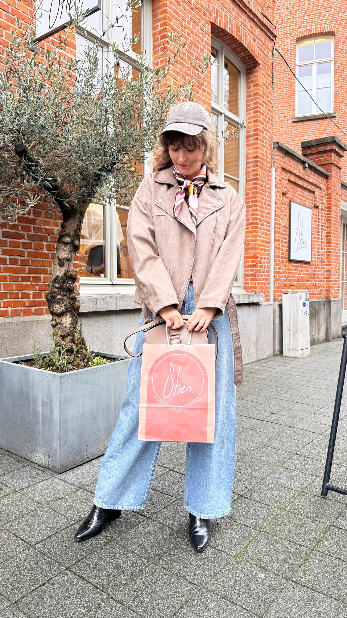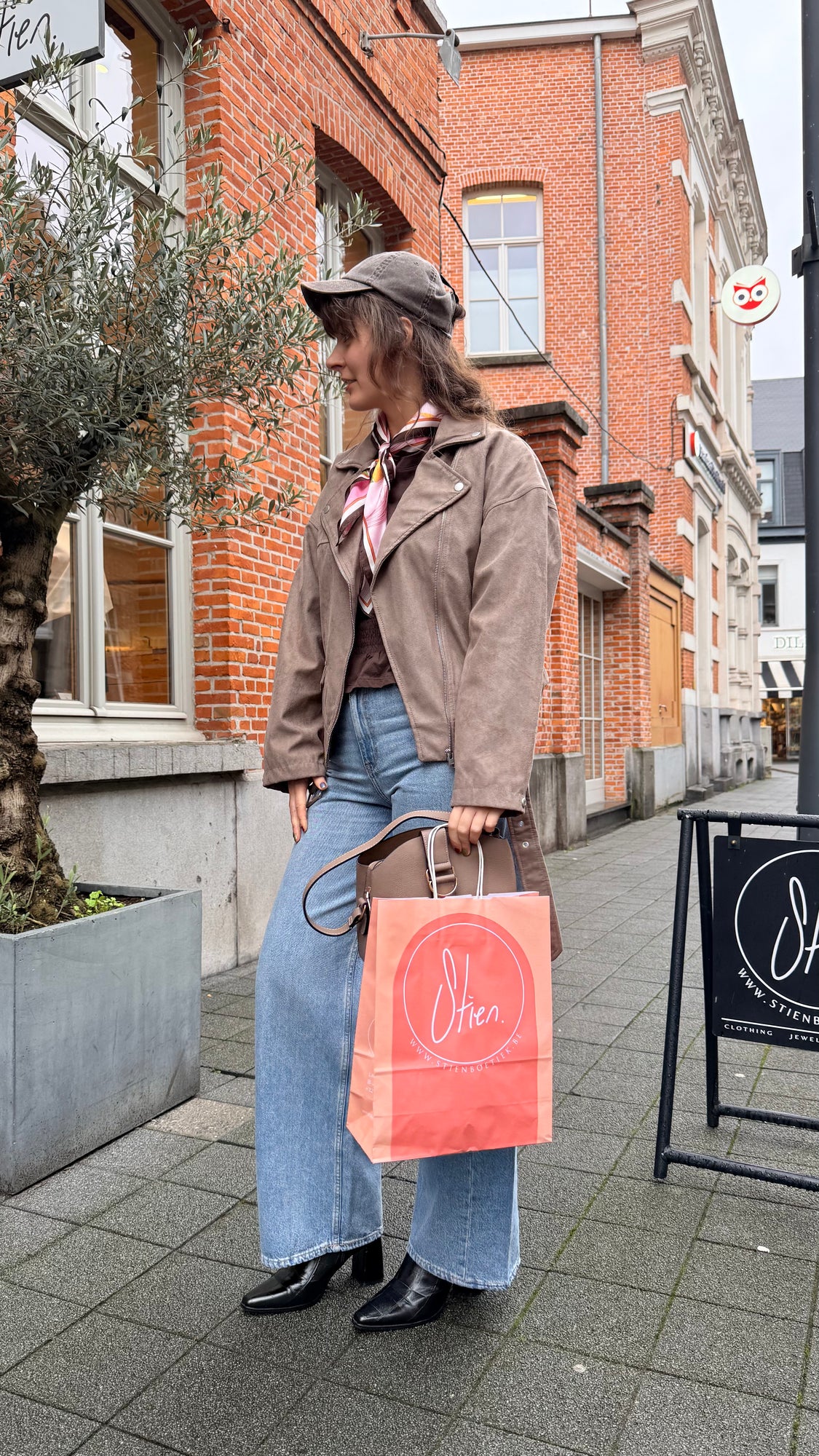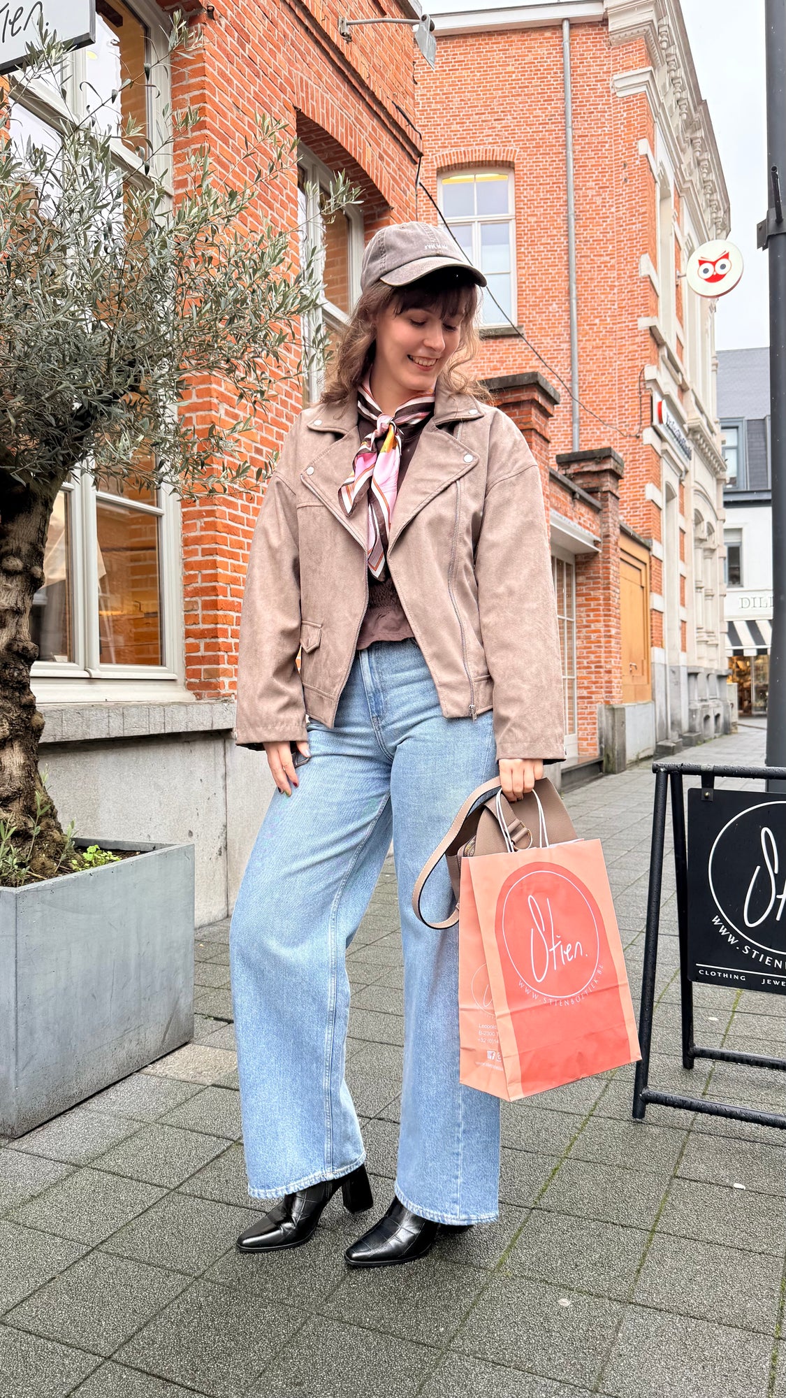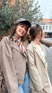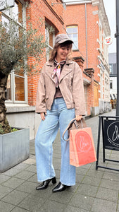Taupe bikerjasje met brushed effect. De jas heeft een rits, steekzakken en riem onderaan. De riem zit achteraan vastgemaakt dus kan er niet uit.