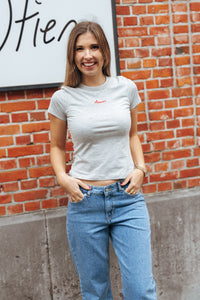 Grijze T-shirt. Aanpassend model met vooraan 'Amour' in rode letters.