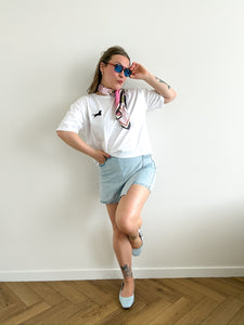 Lichtblauwe denim jeans skort. Het is dus een short met vooraan een rokje over.