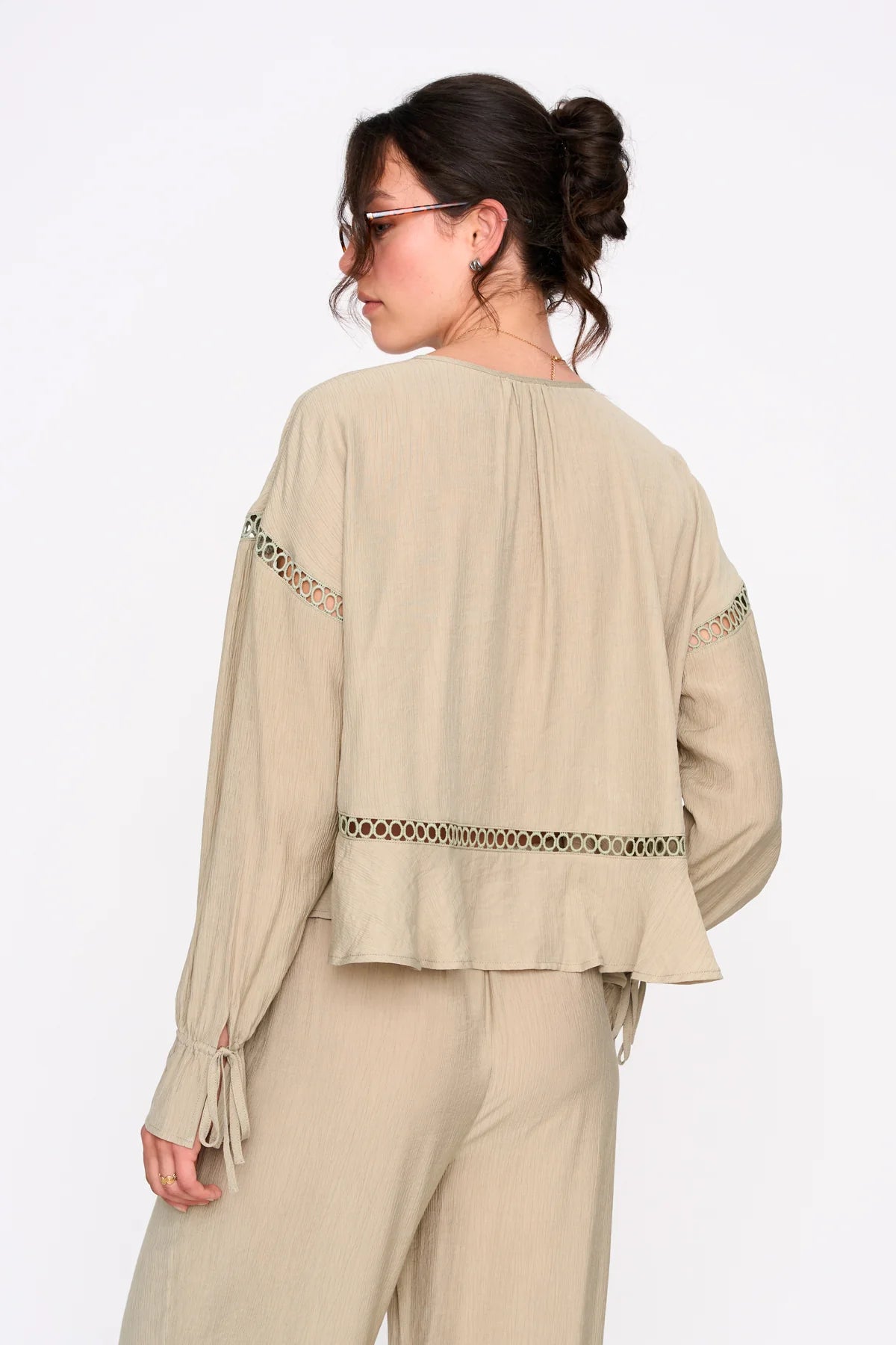 Super luchtige en flowy blouse met kanten details en striklintje vooraan.