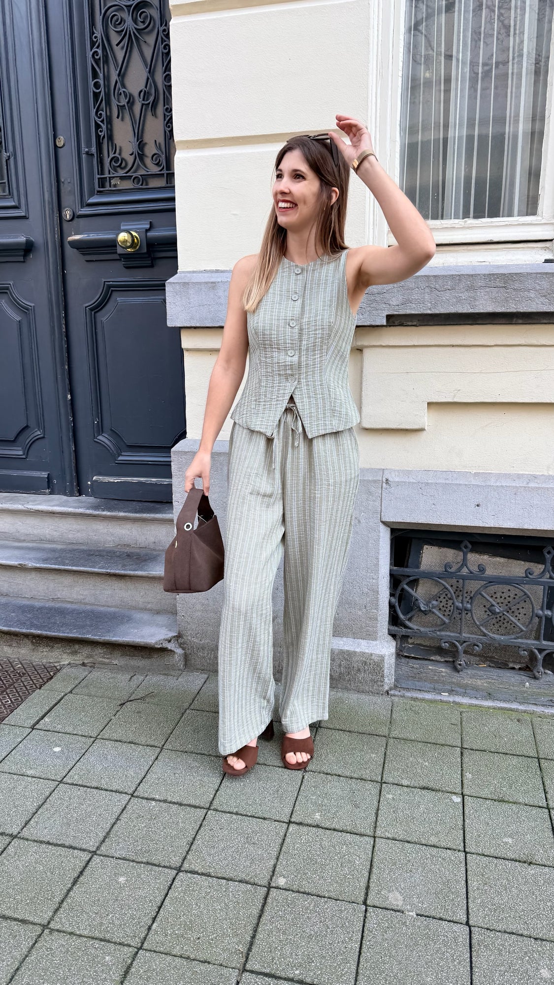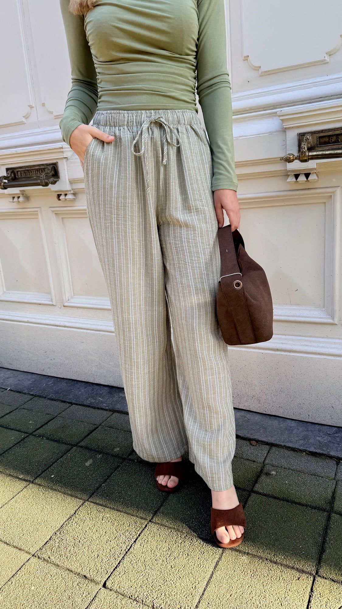Luchtige groene broek met streepjes. Heeft een rekker en touwtje in de taille en steekzakken. Combineer als set met de bijpassende Mel gilet green.