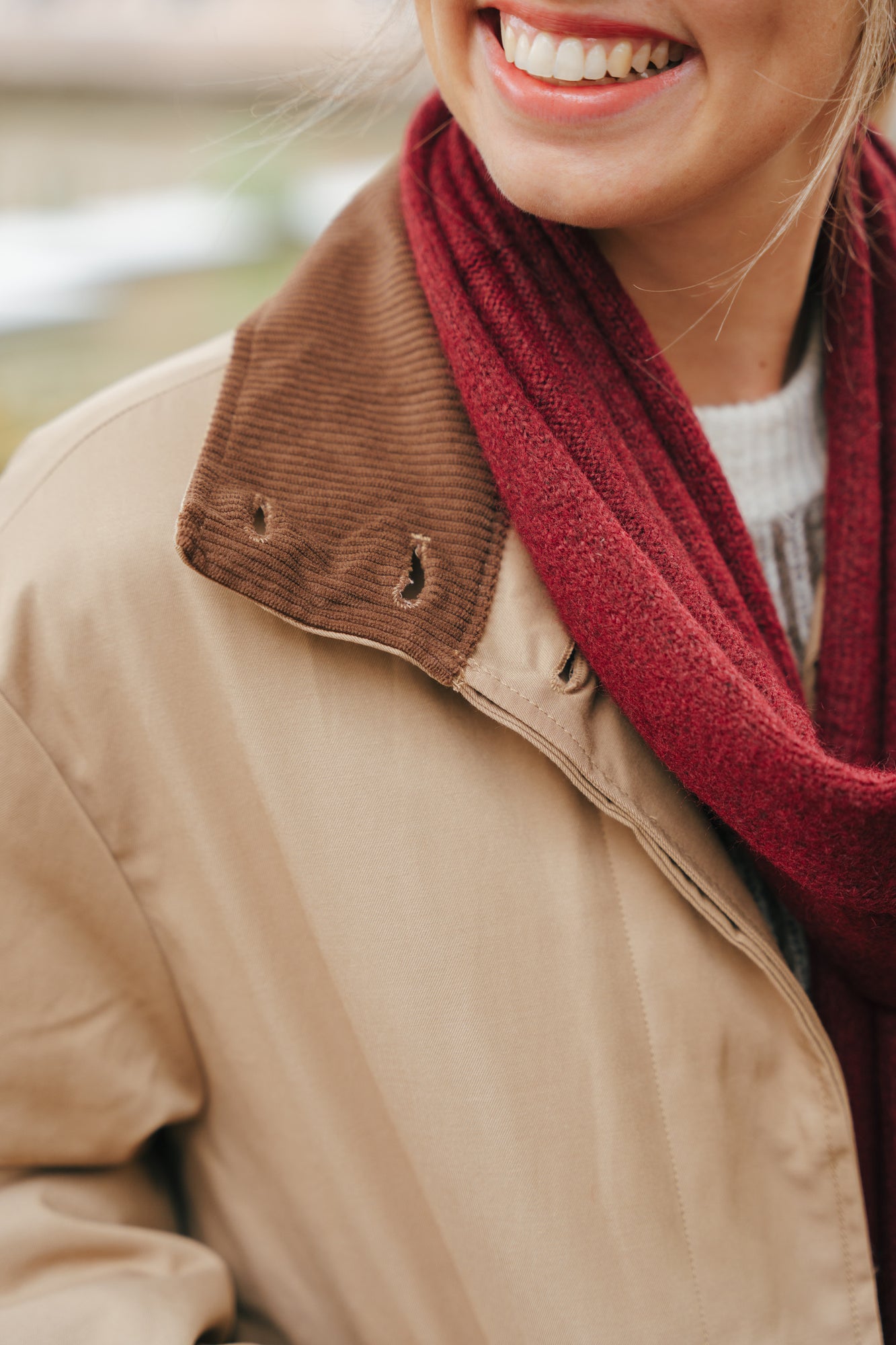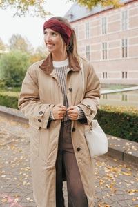Gewatteerde trenchoat met donkerbruine corduroy aan de kraag en mouwen. De jas sluit met knopen.