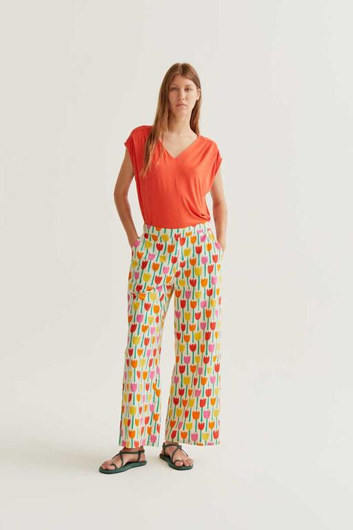 Oranje t-shirt met drapeerdetail aan de schouders. De stof rekt comfortabel mee.