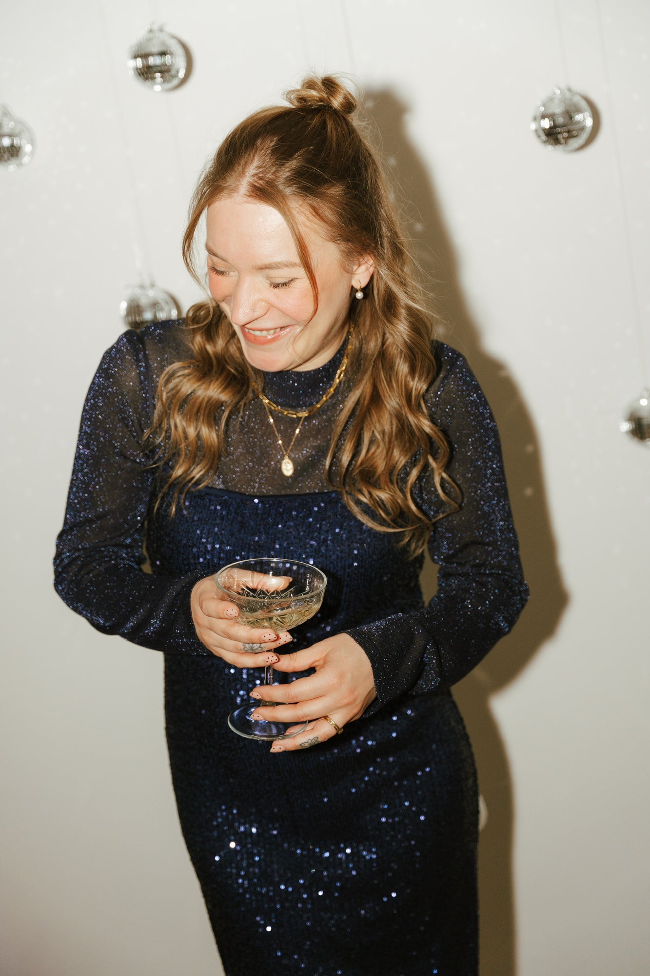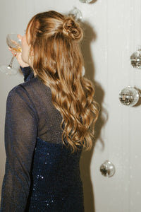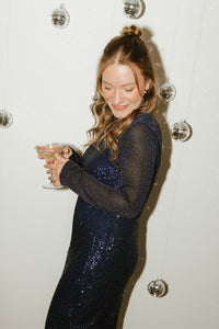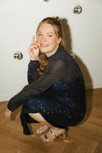 Donkerblauwe midi jurk met pailletten afgewerkt met verstelbare spaghettibandjes en een split aan de zijkant. De jurk is volledig gevoerd.