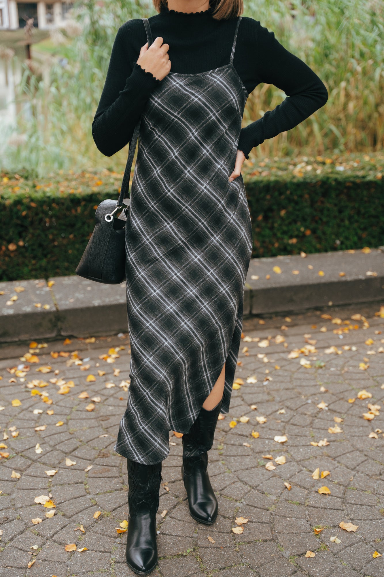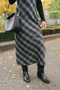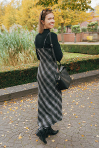 Midi jurk met ruitjes en dunne schouderbandjes. De schouderbandjes zijn verstelbaar. Draag het zo of met een longsleeve onder voor de frissere dagen!