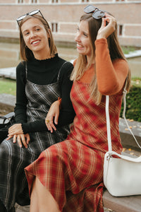 Midi jurk met ruitjes en dunne schouderbandjes. De schouderbandjes zijn verstelbaar. Draag het zo of met een longsleeve onder voor de frissere dagen!