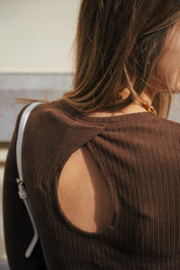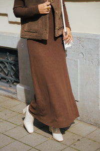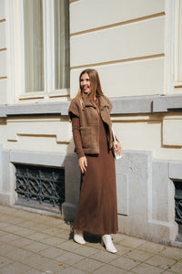 Bruine lange jurk in ribstof met lange mouwen, een ronde hals en een A-lijn rok. De jurk heeft achteraan een kleine opening.
