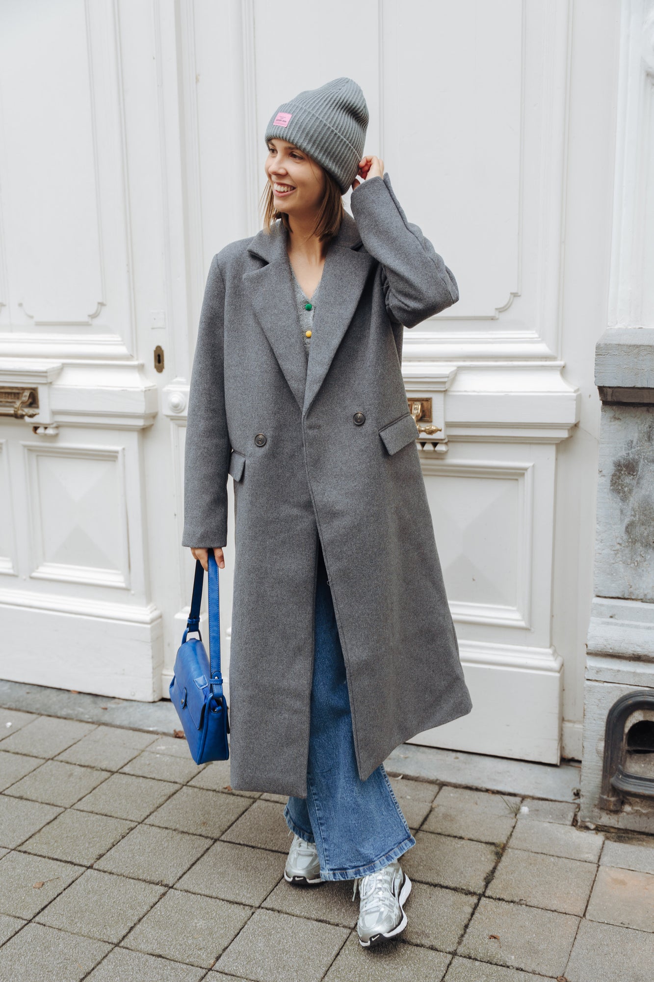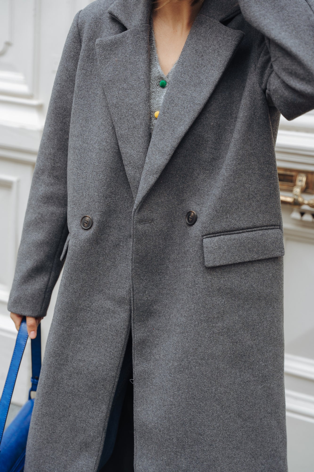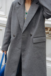 Lange grijze mantel in een warme, zware stof afgewerkt met een dubbele knoop en zakken vooraan. Heel fijn om te dragen.