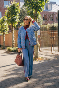 Blauw jasje met schattige bloemenprint afgewerkt met bordeaux biezen, knopen en steekzakken.