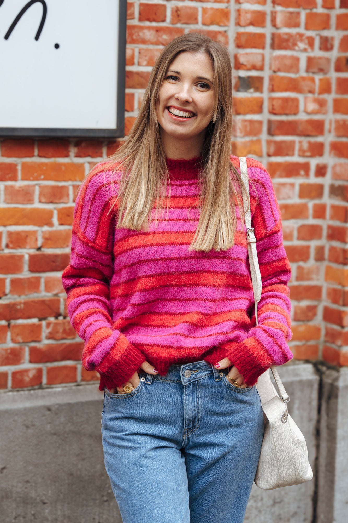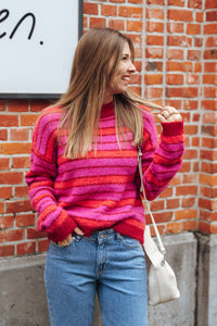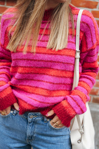 Gebreide trui met roze, bordeaux en rode strepen.