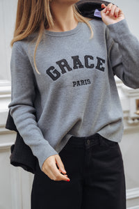Grijze fijn gebreide trui met zwarte varsity-style letters op de voorkant.