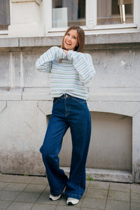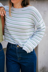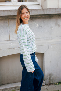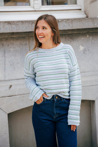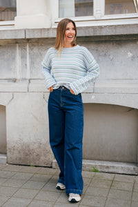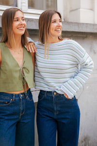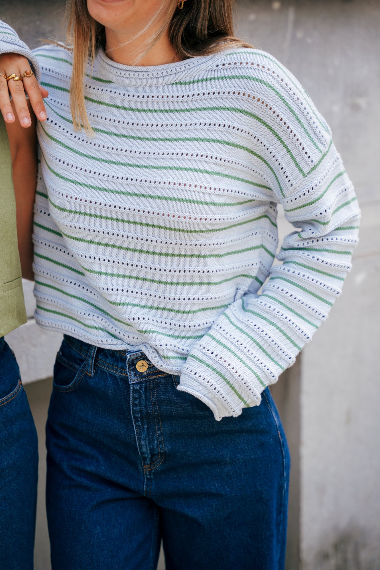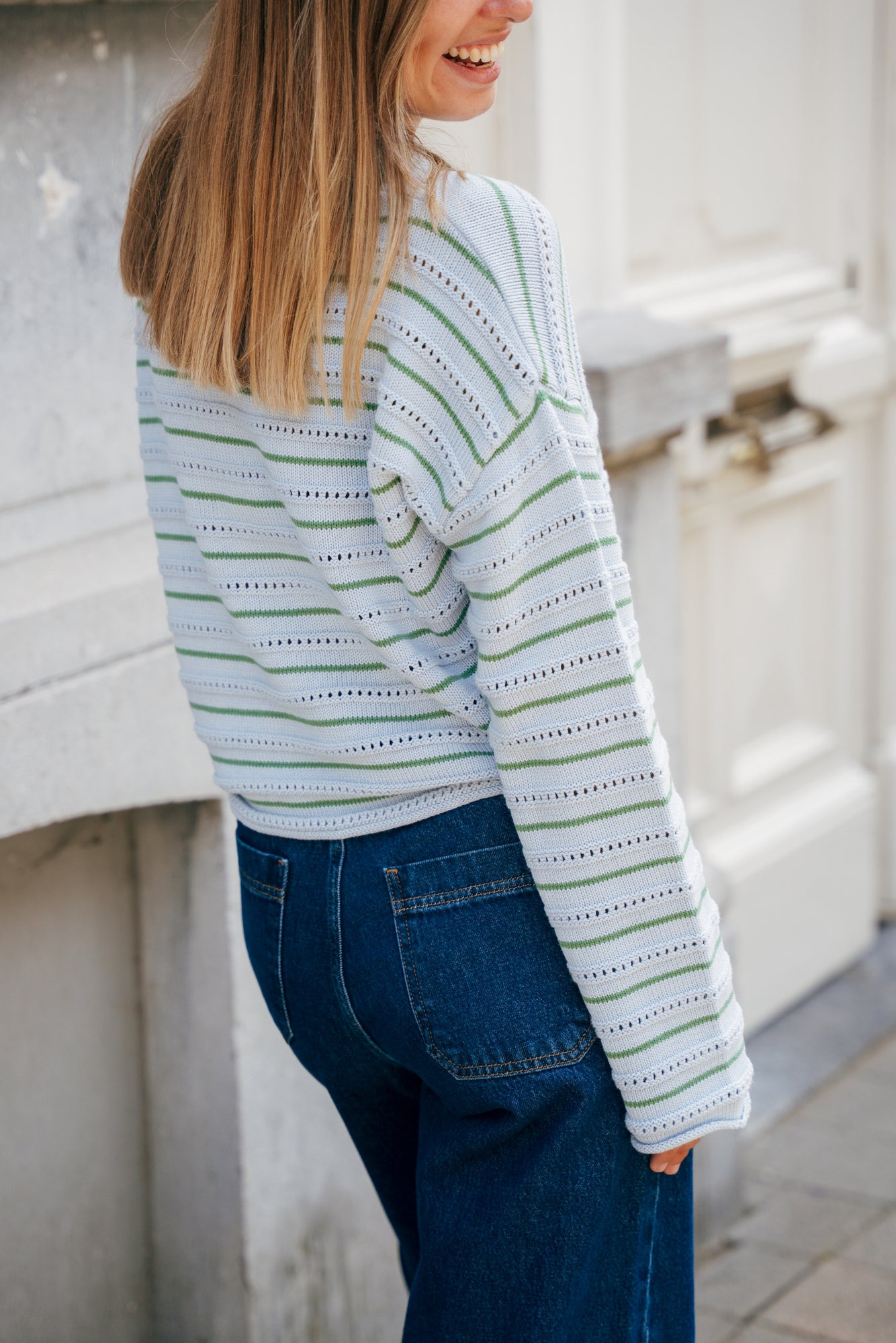 Lichtblauw met groen gestreepte crochet trui. Korter model.