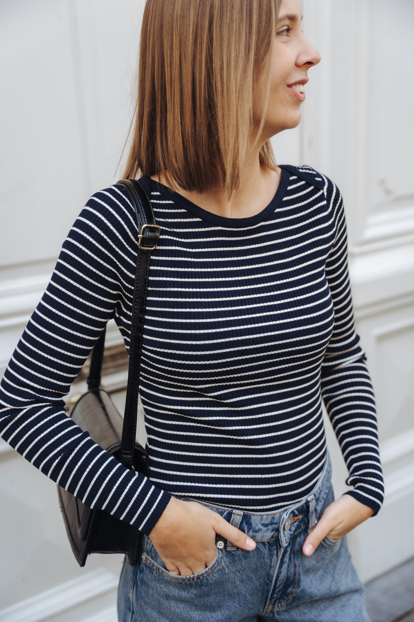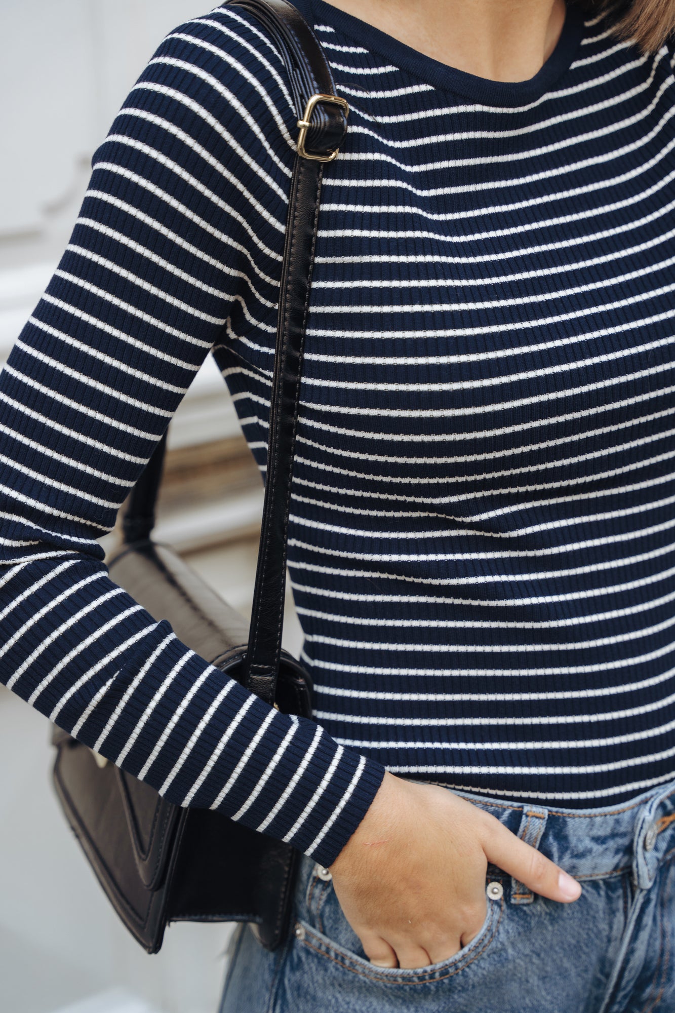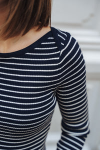 Donkerblauw gebreid truitje met lange mouwen met witte streepjes. De top is afgewerkt met een boothals.