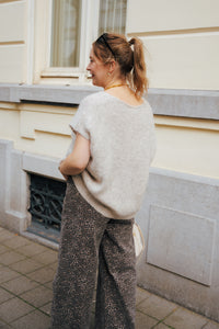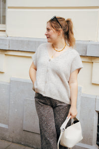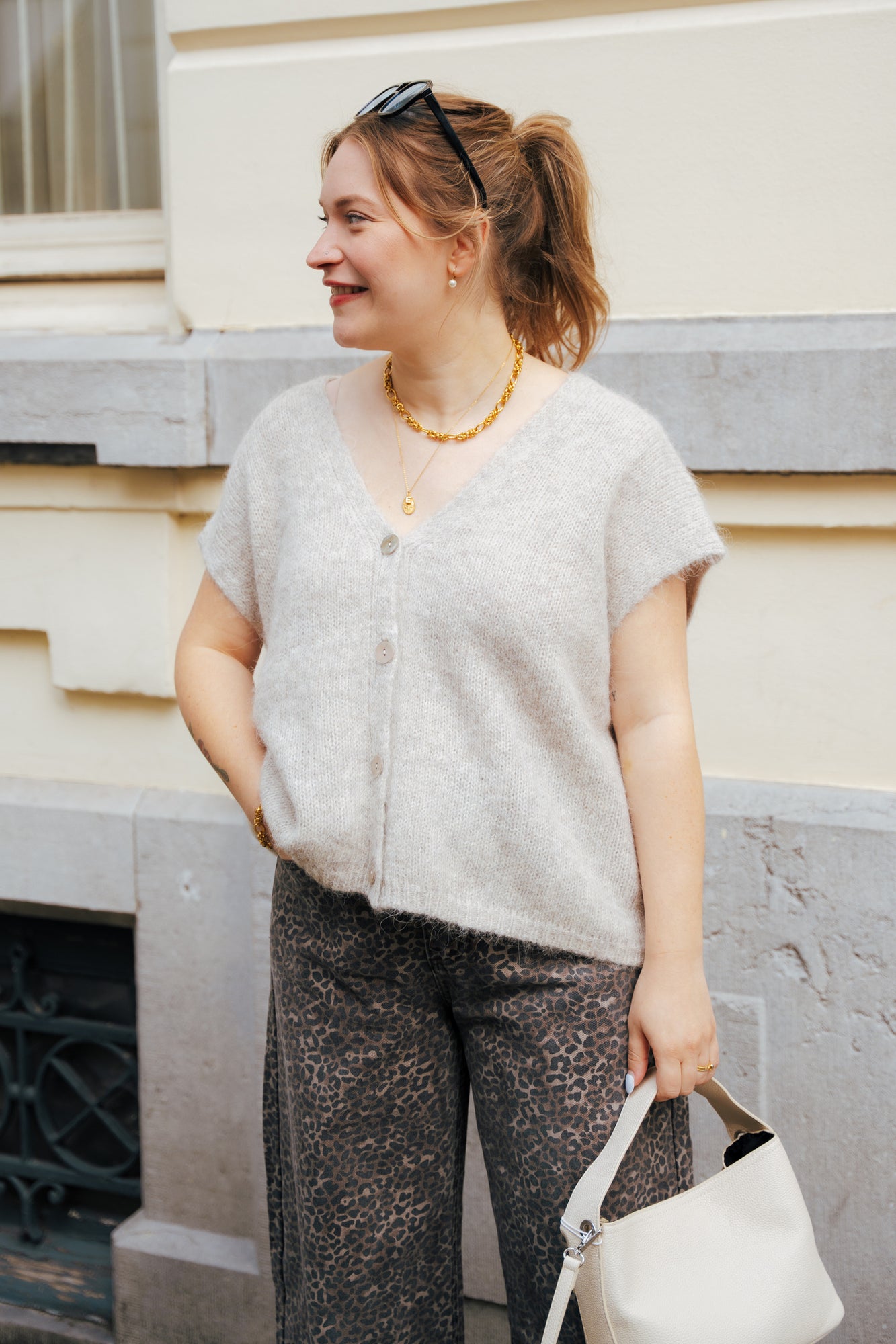 Beige gebreide gilet met V-hals en knopen vooraan.