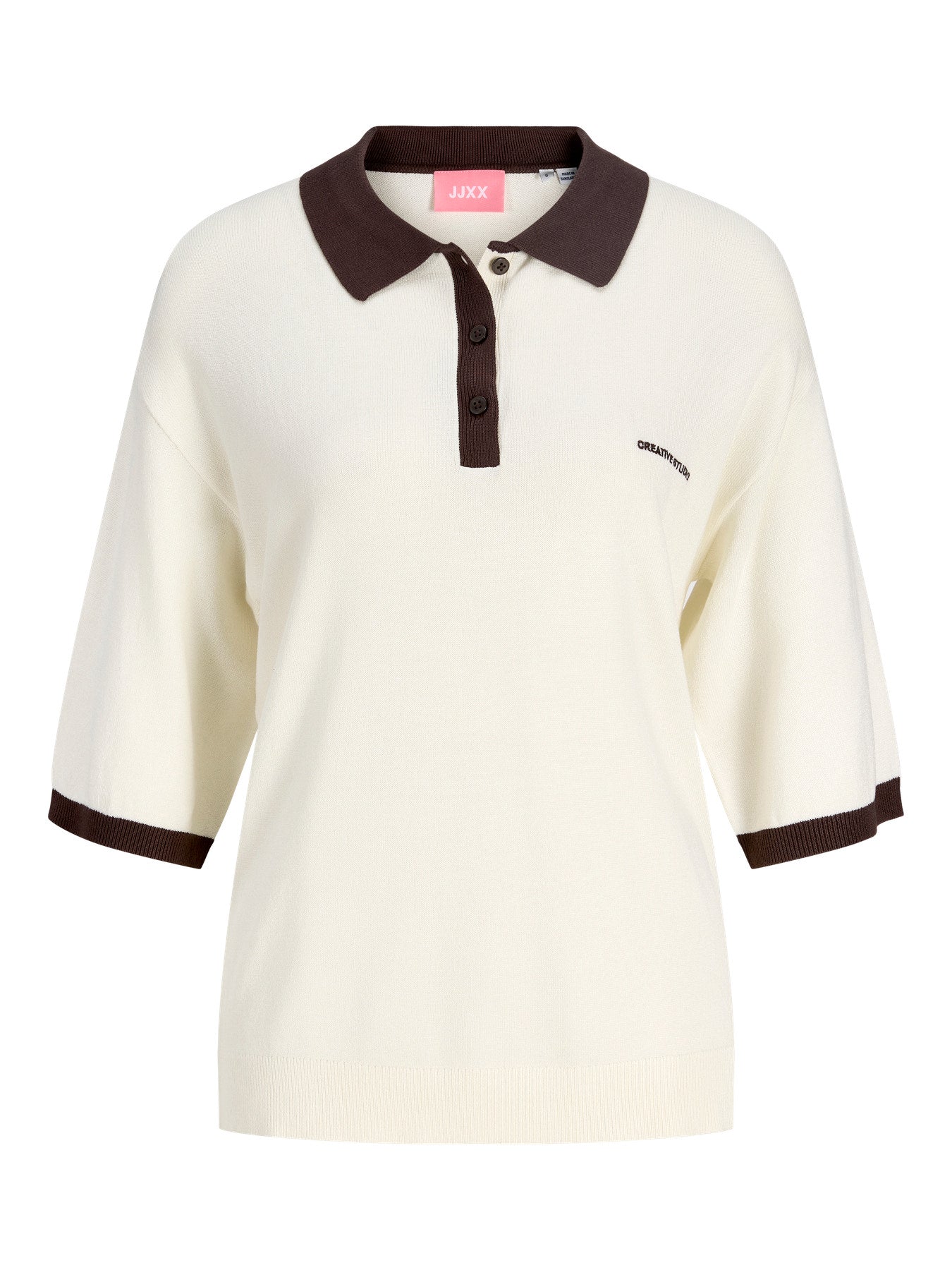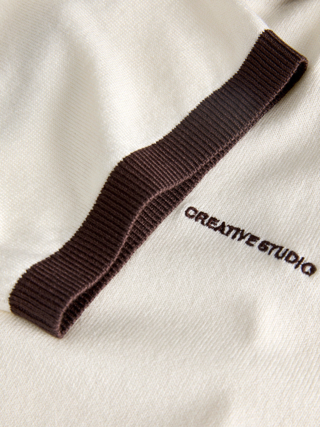 Crèmekleurige gebreide polo met donkerbruine kraag en biezen met geborduurd opschrift 'Creative studio'.