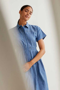 Deze denim maxidress heeft een flatterende taille dankzij de rekker en opvallende oranje stiksels voor dat extra detail. Een tijdloos model dat stijl en comfort moeiteloos combineert.