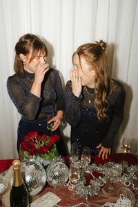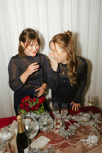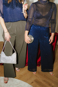 Donkerblauw dun gebreid truitje met opstaande hals en glitterdraad in de stof. De longsleeve is een beetje doorschijnend.