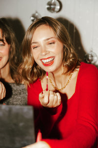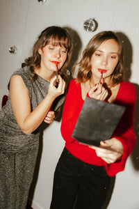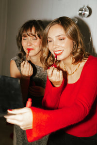 Felrode gebreide top met vierkante halslijn en uitlopende mouwen.