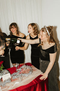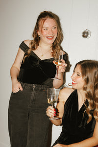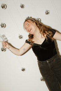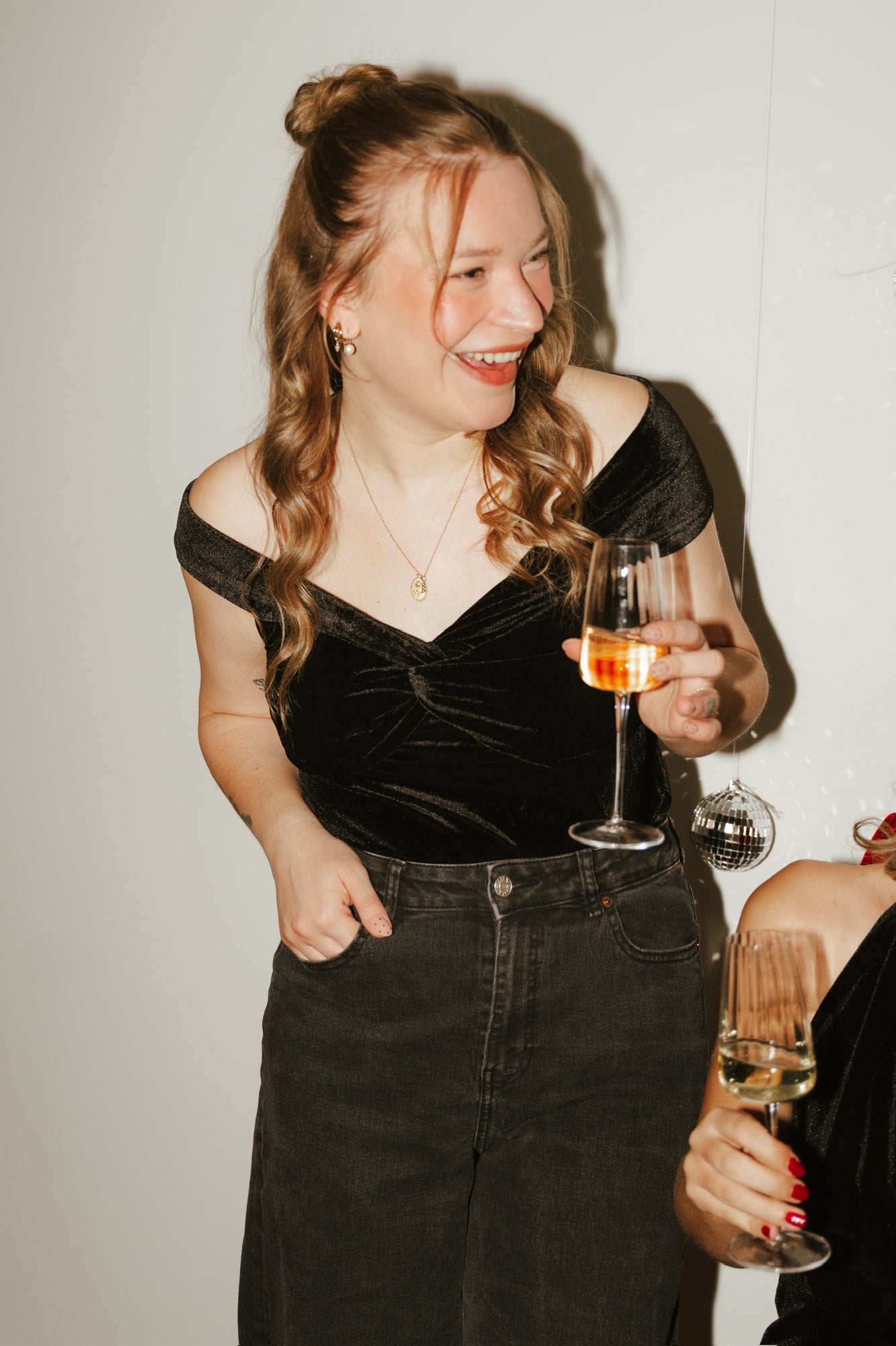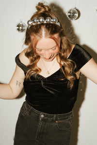 Zwarte off-shoulder body in velours stof met geknoopt effect op de borst. De body heeft onderaan drukknopen.