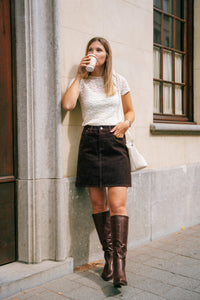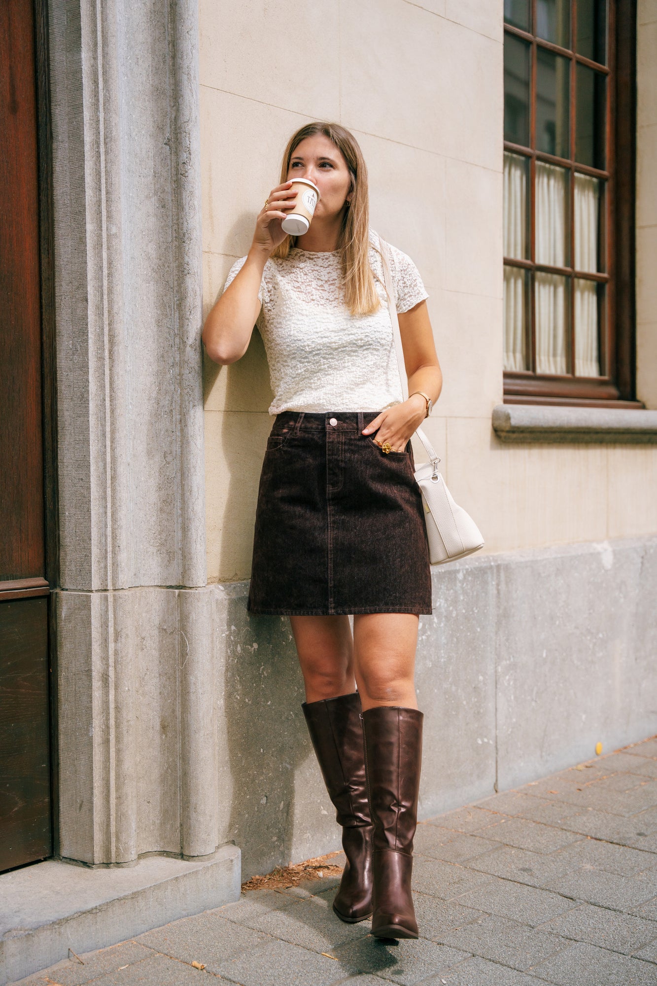 Ecru kanten T-shirt met kapmouwen afgewerkt met ruffles aan de biezen.