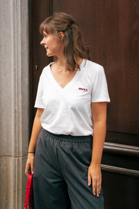 Wit T-shirt met V-hals met rode tekst 'Bisous' op de borst.