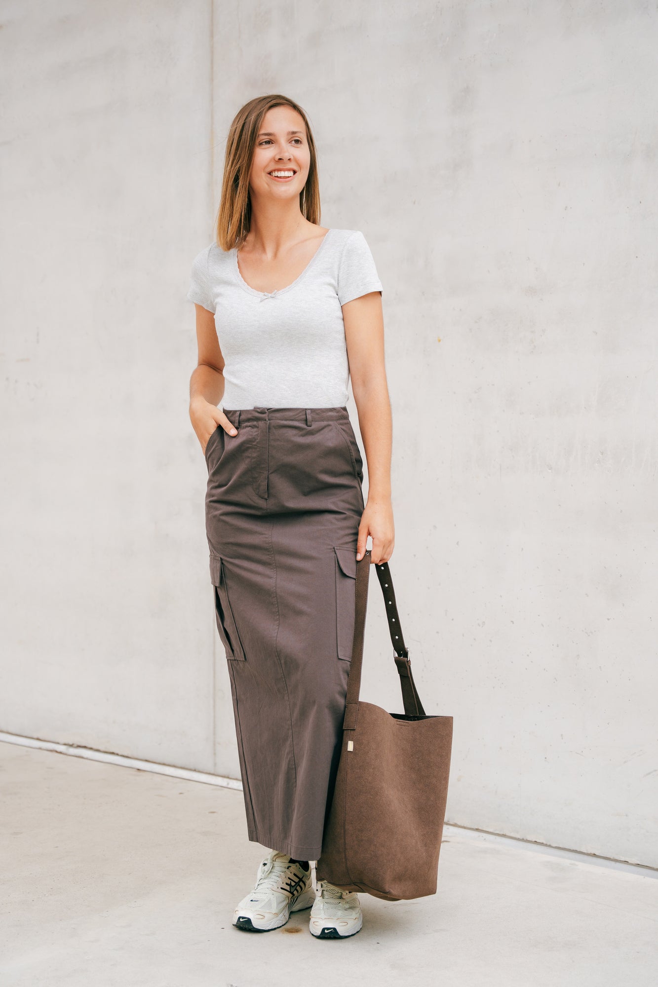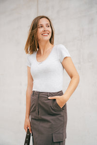 Grijs T-shirt in ribstof met kapmouwen afgewerkt met kant aan de V-hals.