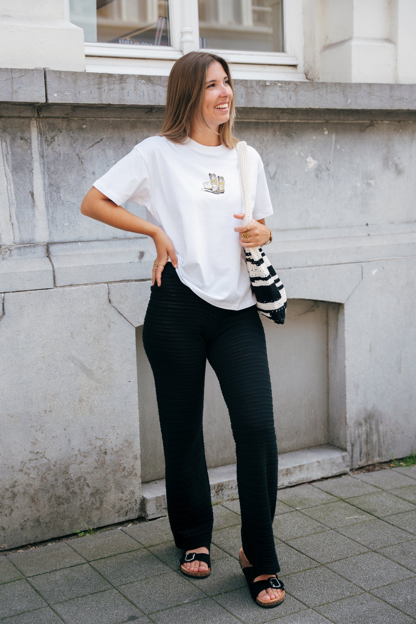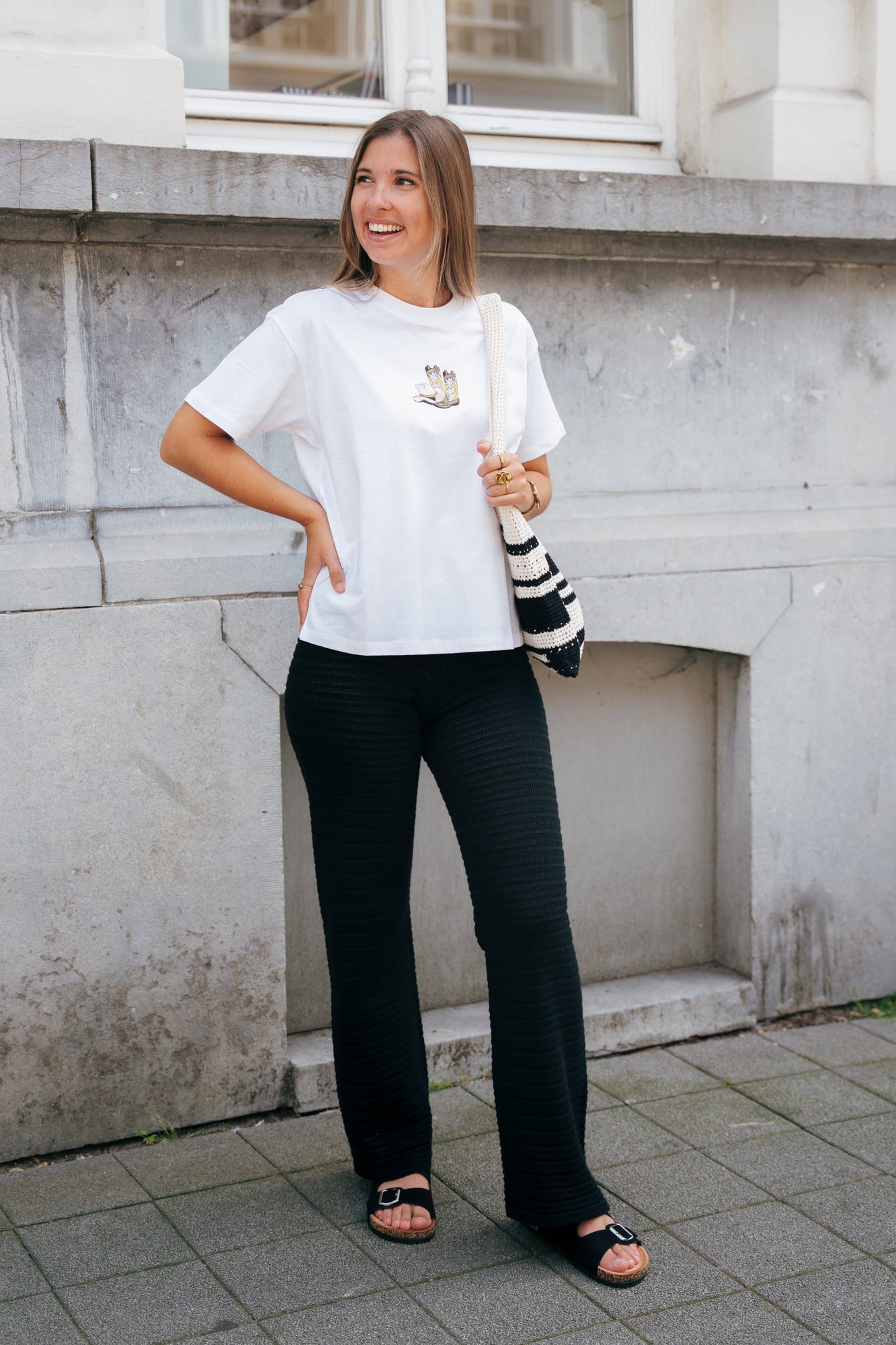Wit T-shirt met cowboyhoed en -laarzen op de borst.