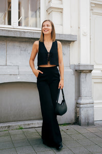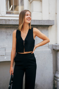 Zwarte top met strikjes vooraan. Deze combineer je heel mooi met de bijpassende Rousse skirt black.