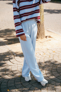 Lichtblauwe joggingbroek met wijde pijpen afgewerkt met een rekker met trekkoord in de taille en steekzakken.