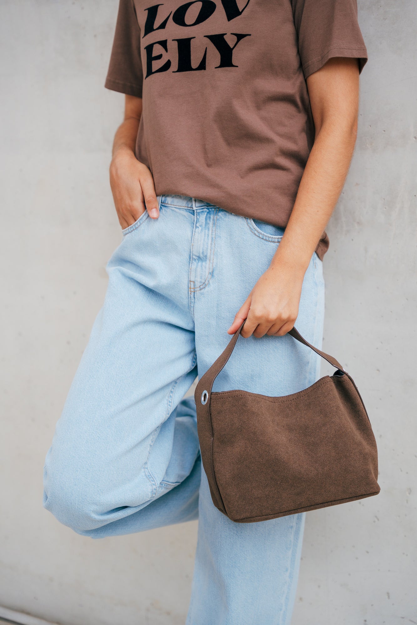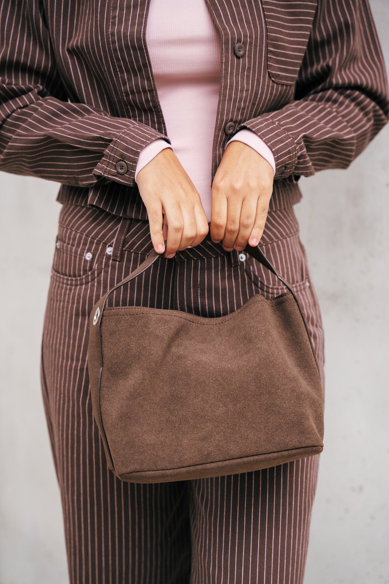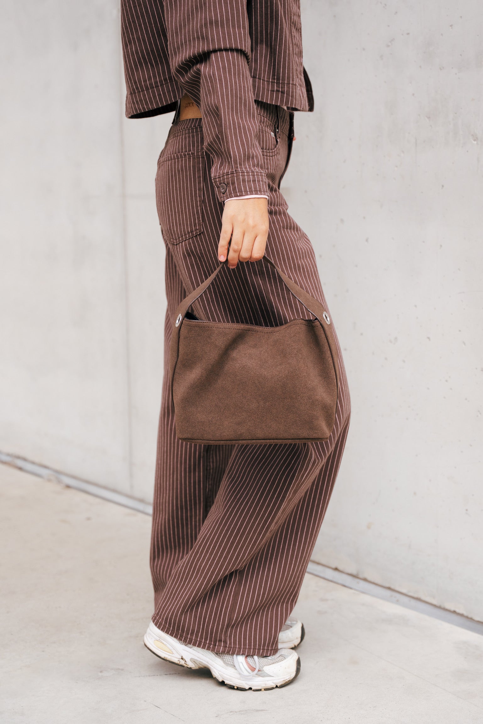 Deinen bruine handtas met kort hengsel. De handtas sluit met een magneetsluiting en heeft aan de binnenkant twee kleine vakjes. Er zit een lang hengsel bij.