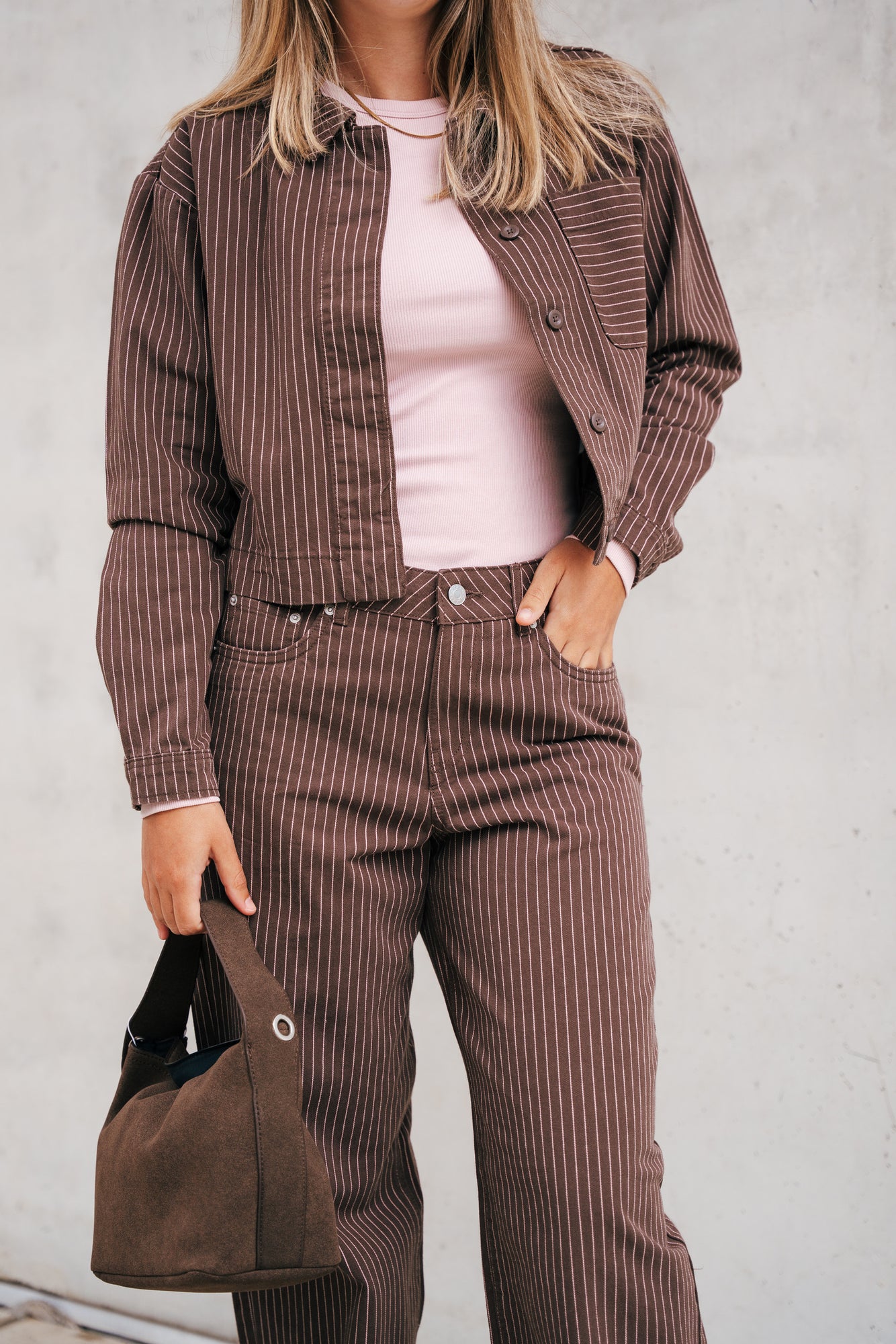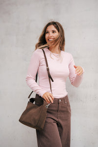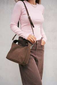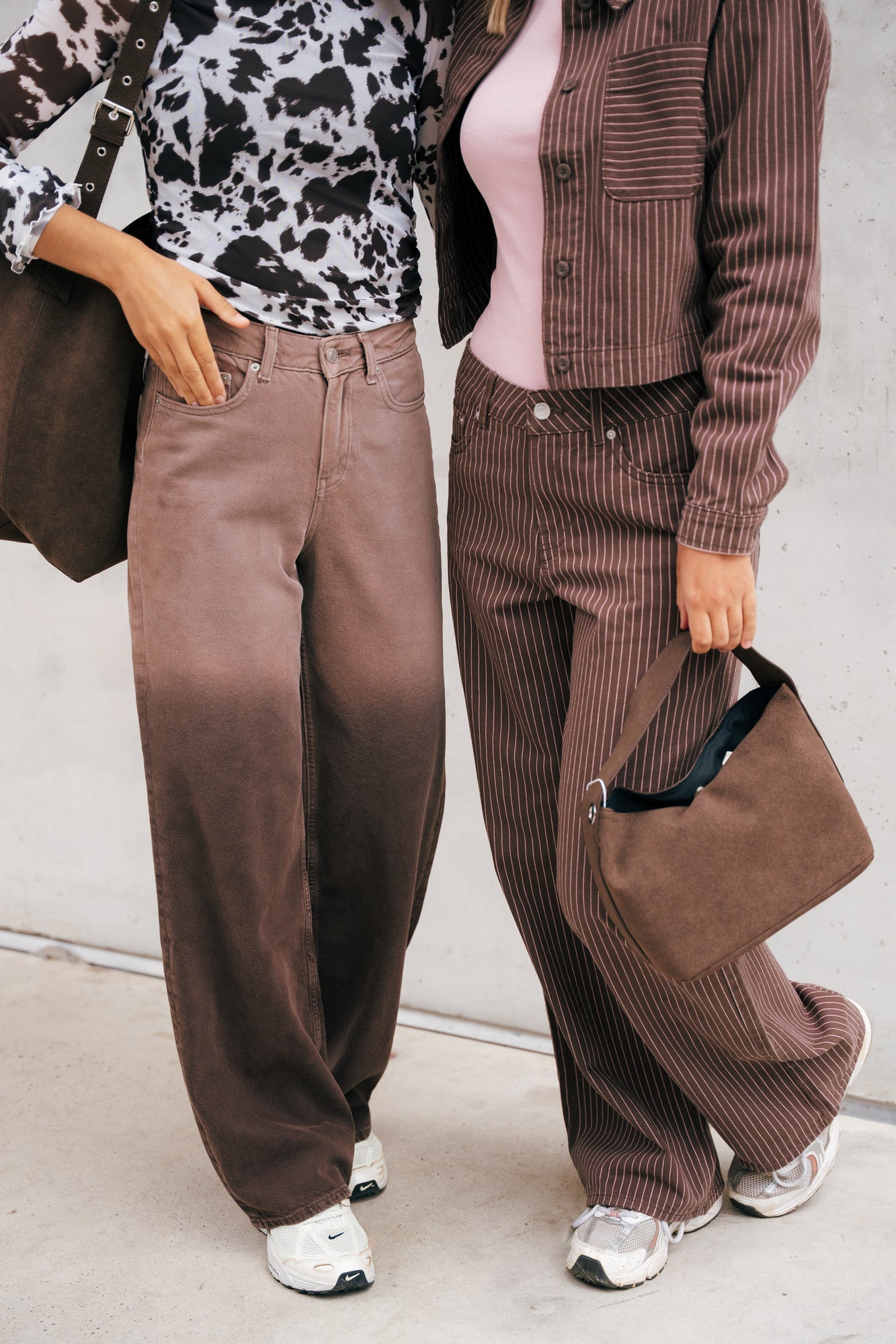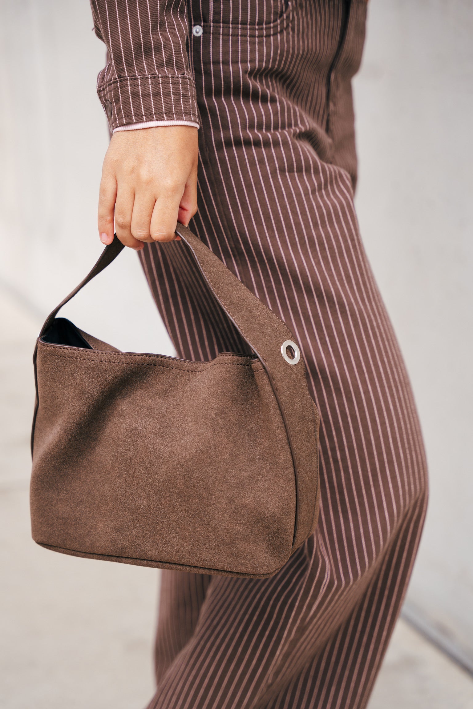 Deinen bruine handtas met kort hengsel. De handtas sluit met een magneetsluiting en heeft aan de binnenkant twee kleine vakjes. Er zit een lang hengsel bij.
