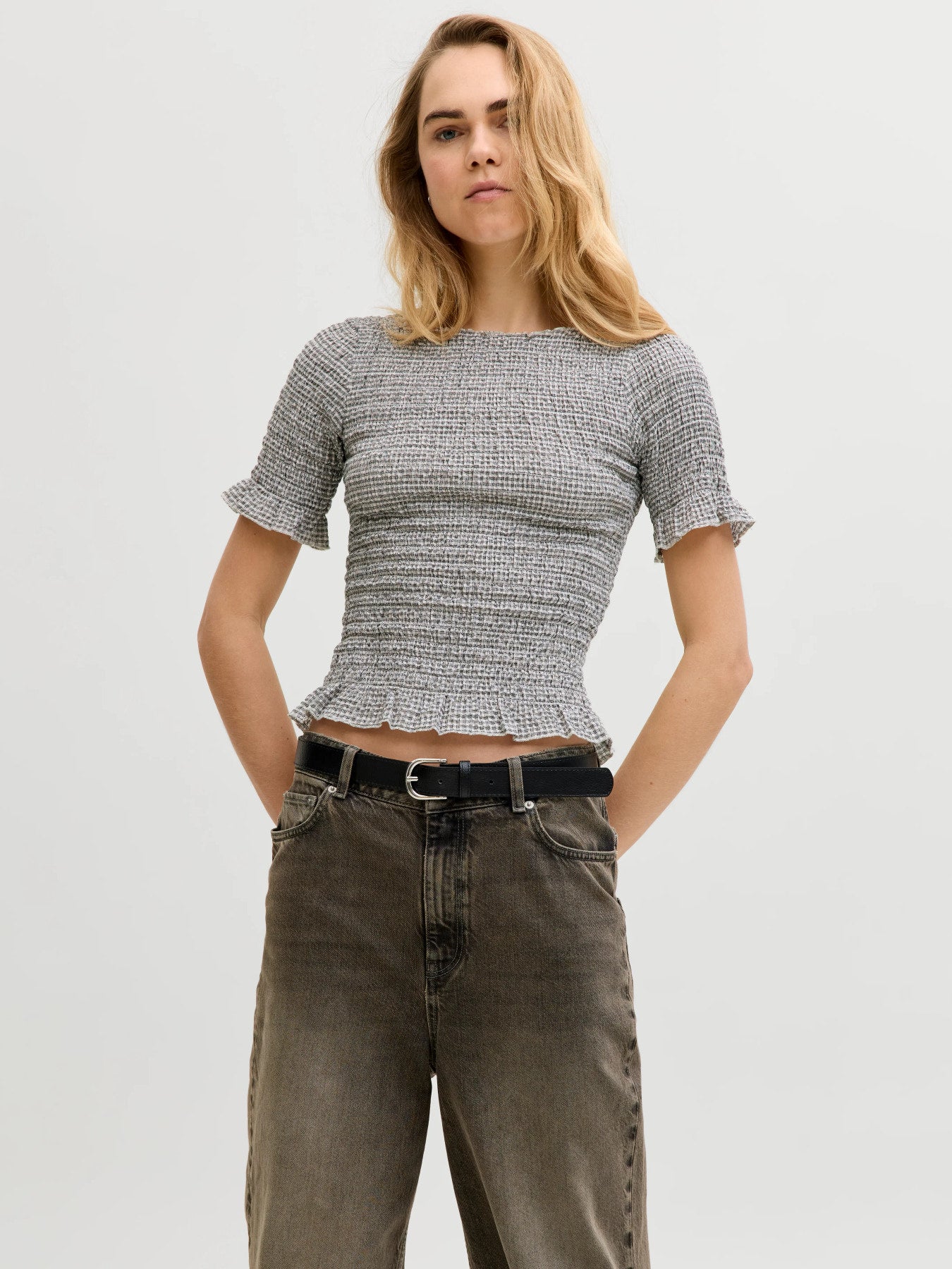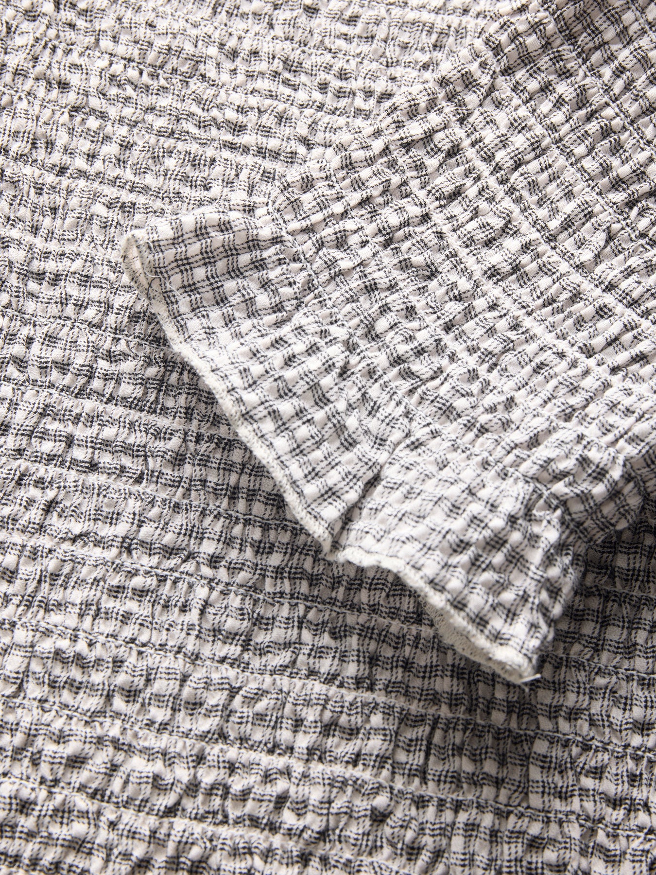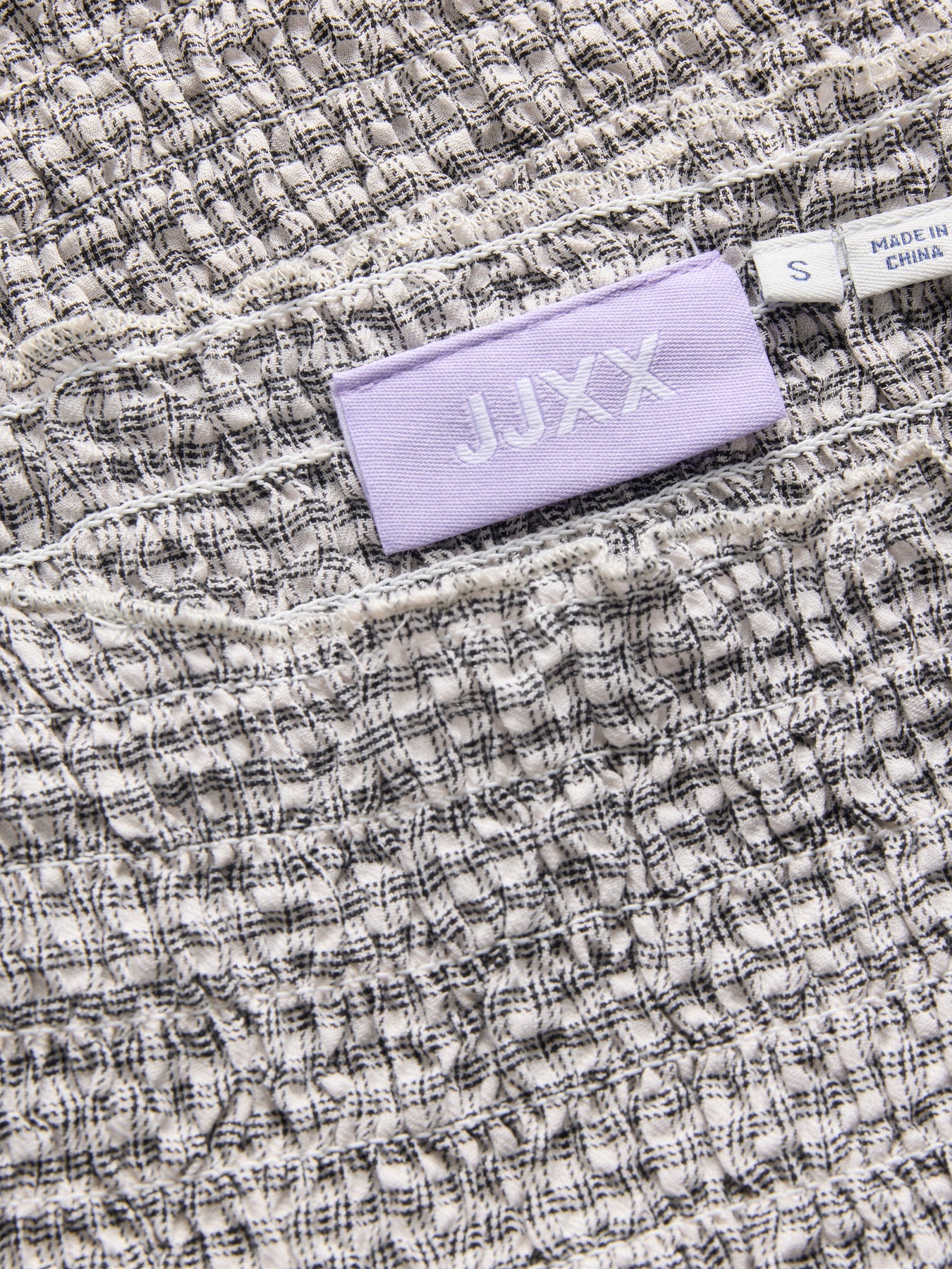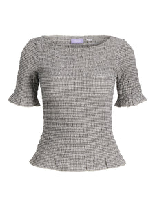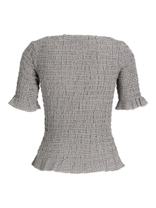 Wit met zwart geruite smock top met korte mouwen en een wijde hals.