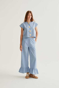 De Claudette Daisy top is een lichtblauw mouwloos hemdje met knoopjes afgewerkt met een fijn broderie daisy bloempje. Té schattig en perfect voor zonnige dagen.