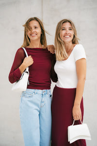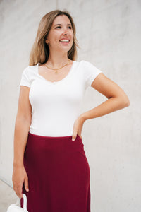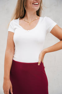 Wit T-shirt in ribstof met kapmouwen afgewerkt met kant aan de V-hals.