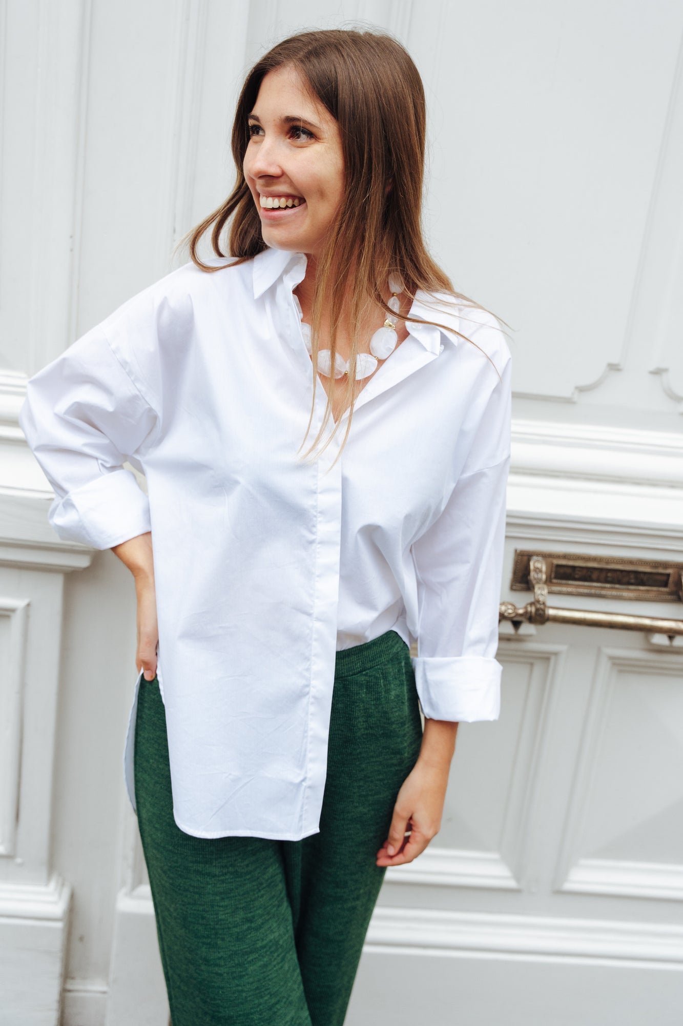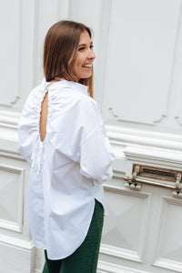 Wit hemd met cut-out op de rug. Een goede basic met een uniek detail. De cut-out komt niet te laag waardoor je er een gewone beha onder kan dragen.