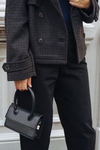 Kleine zwarte handtas opstaand handvat en magneetsluiting. Er zit ook een langer hengsel bij om de tas crossbody te dragen.