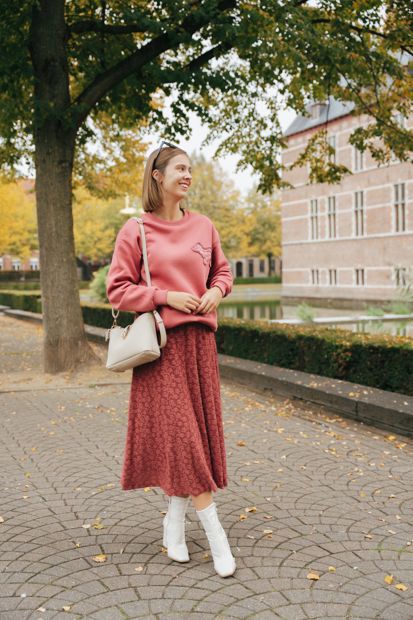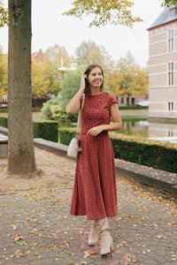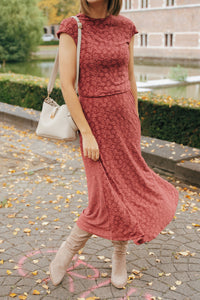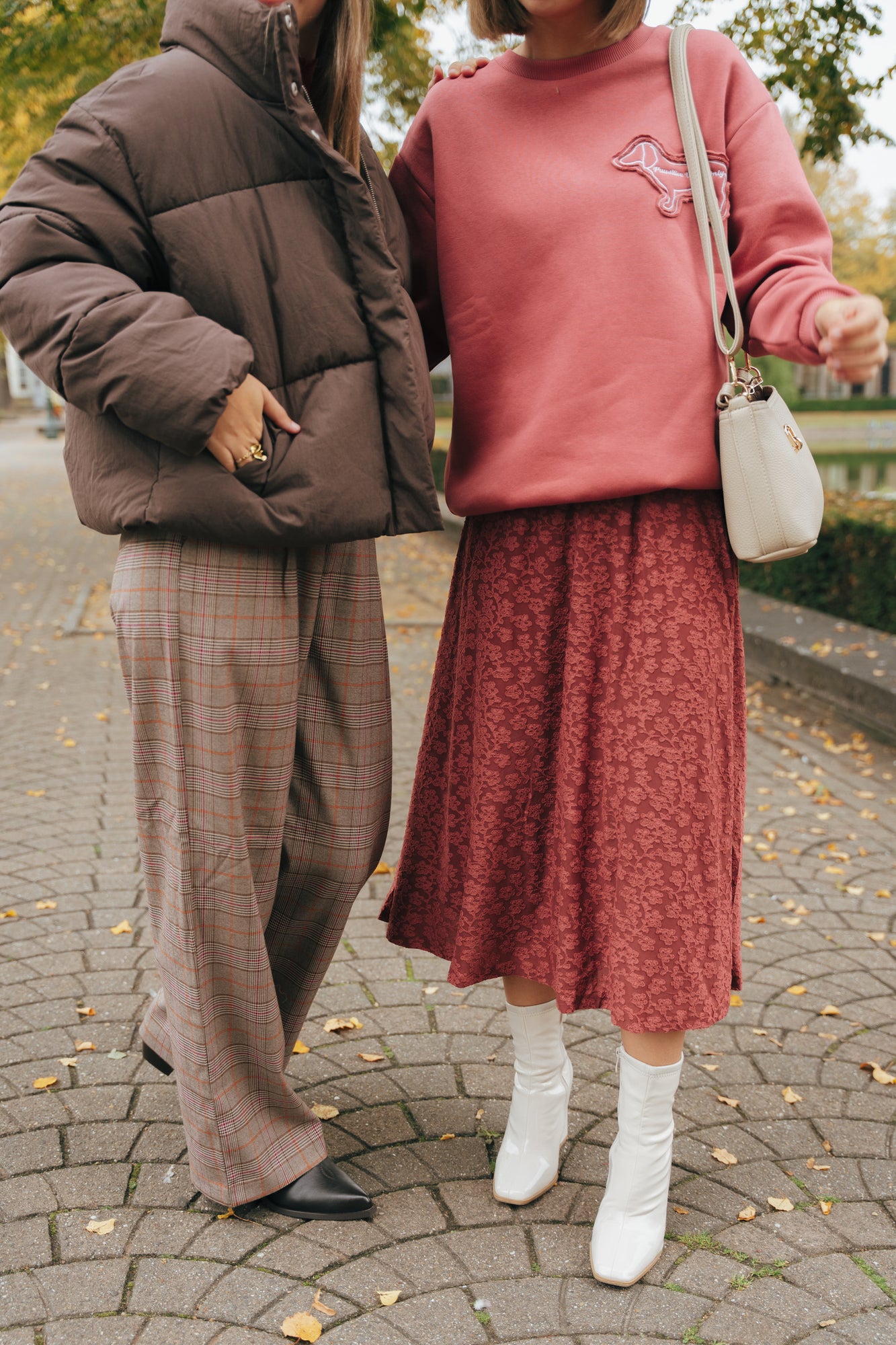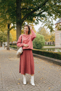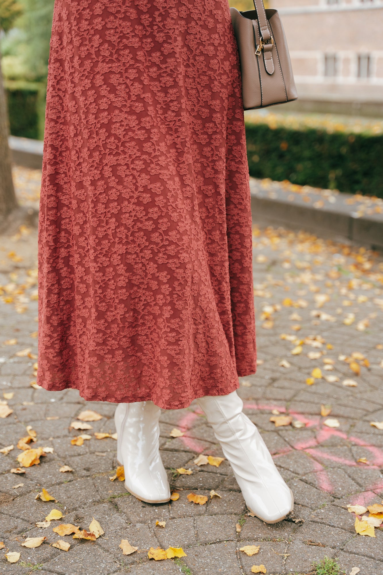 Roestkleurige A-lijn rok met bloemenpatroon in de stof. De rok heeft een rekker in de taille en is volledig gevoerd.