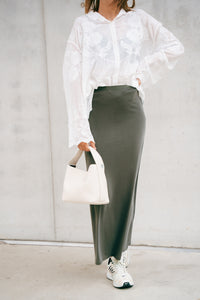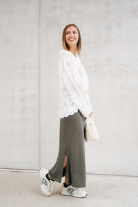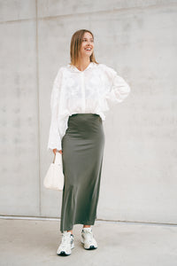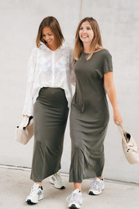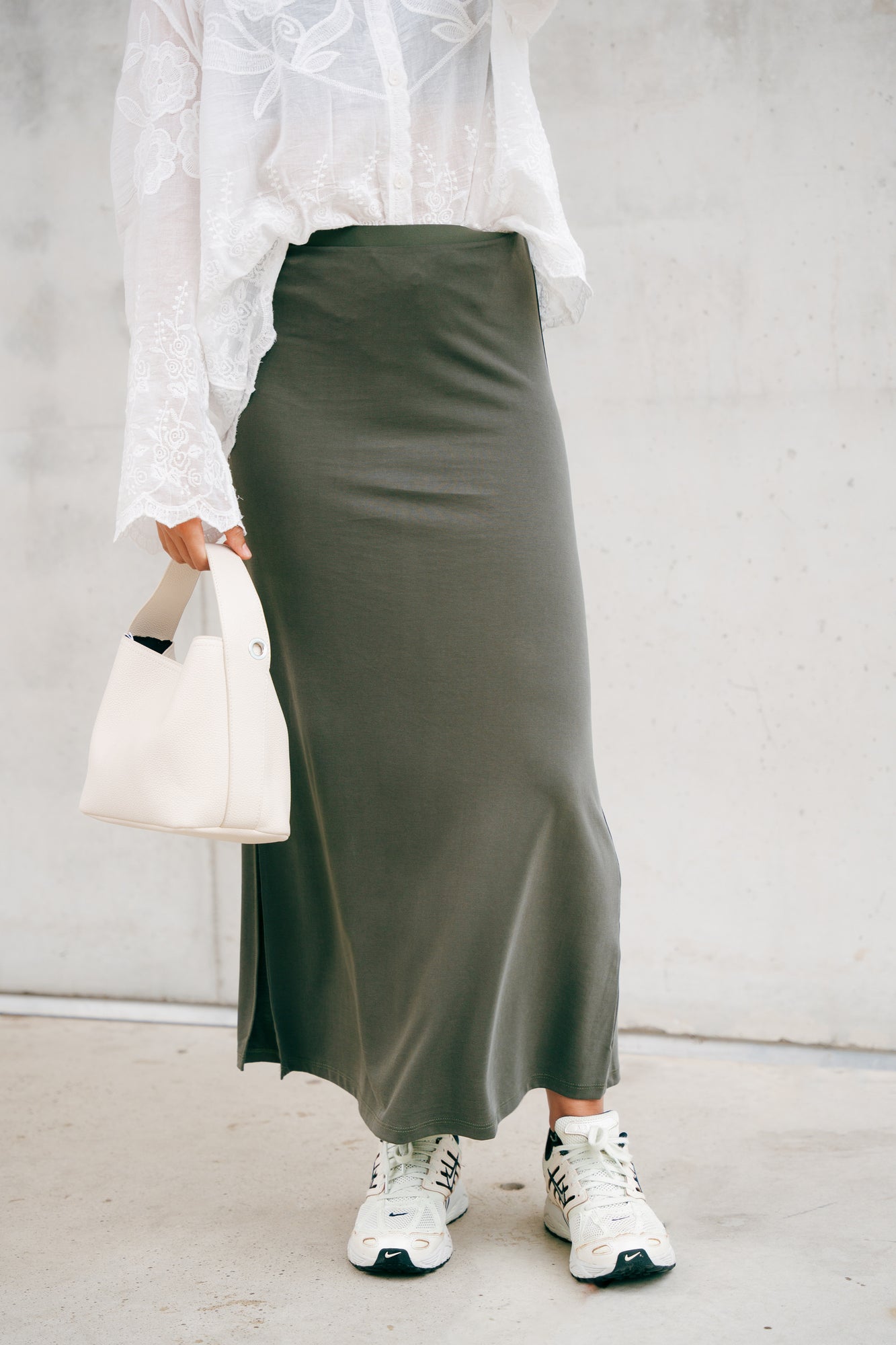 Super zachte, vlotte rechte rok van stretchy stof en rekker aan de taille. Deze combineer je heel mooi met de bijpassende Parma T-shirt kaki.