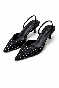 Een slingback kittenheel met punt in zwarte polkadot. Een echt trenditem!